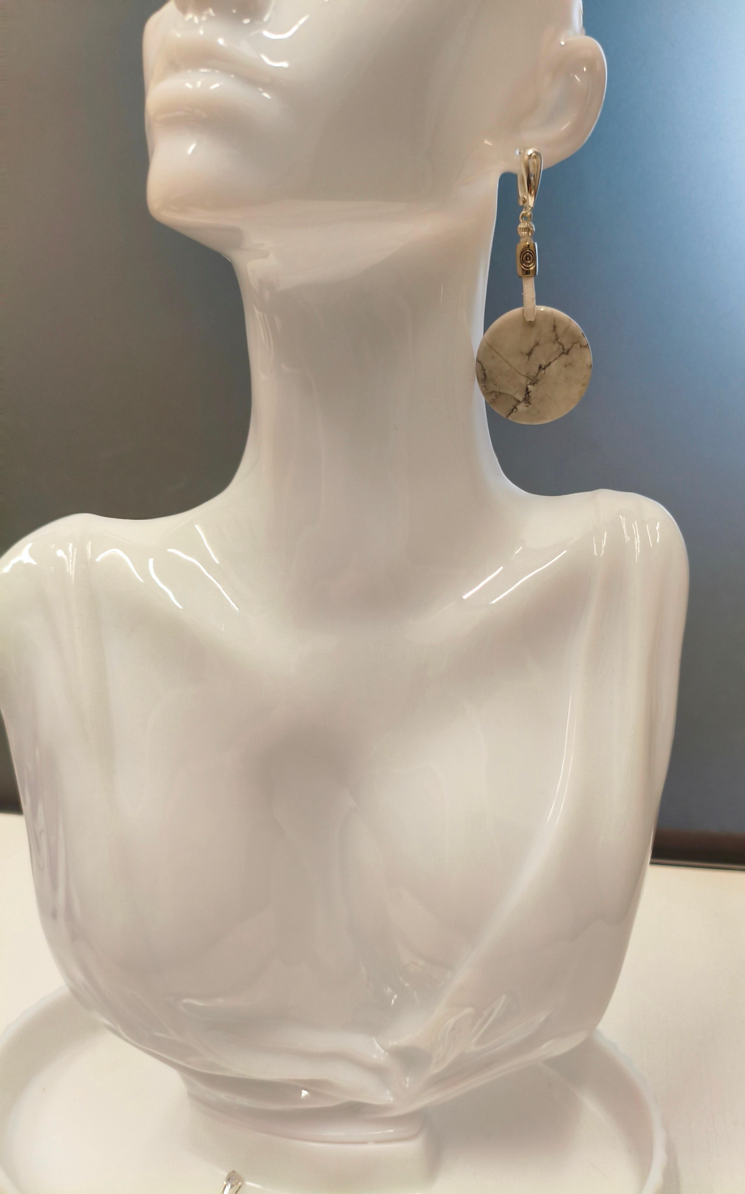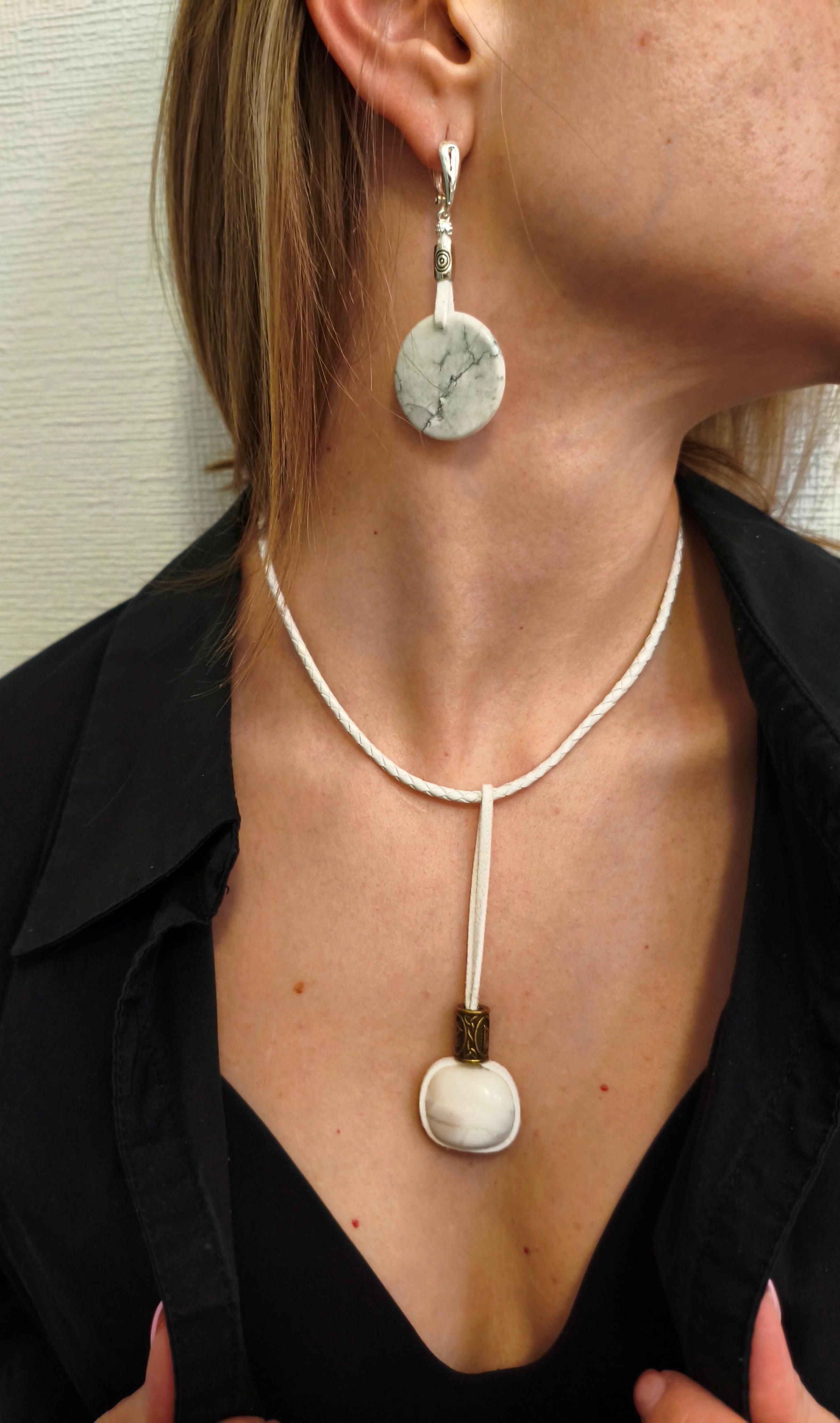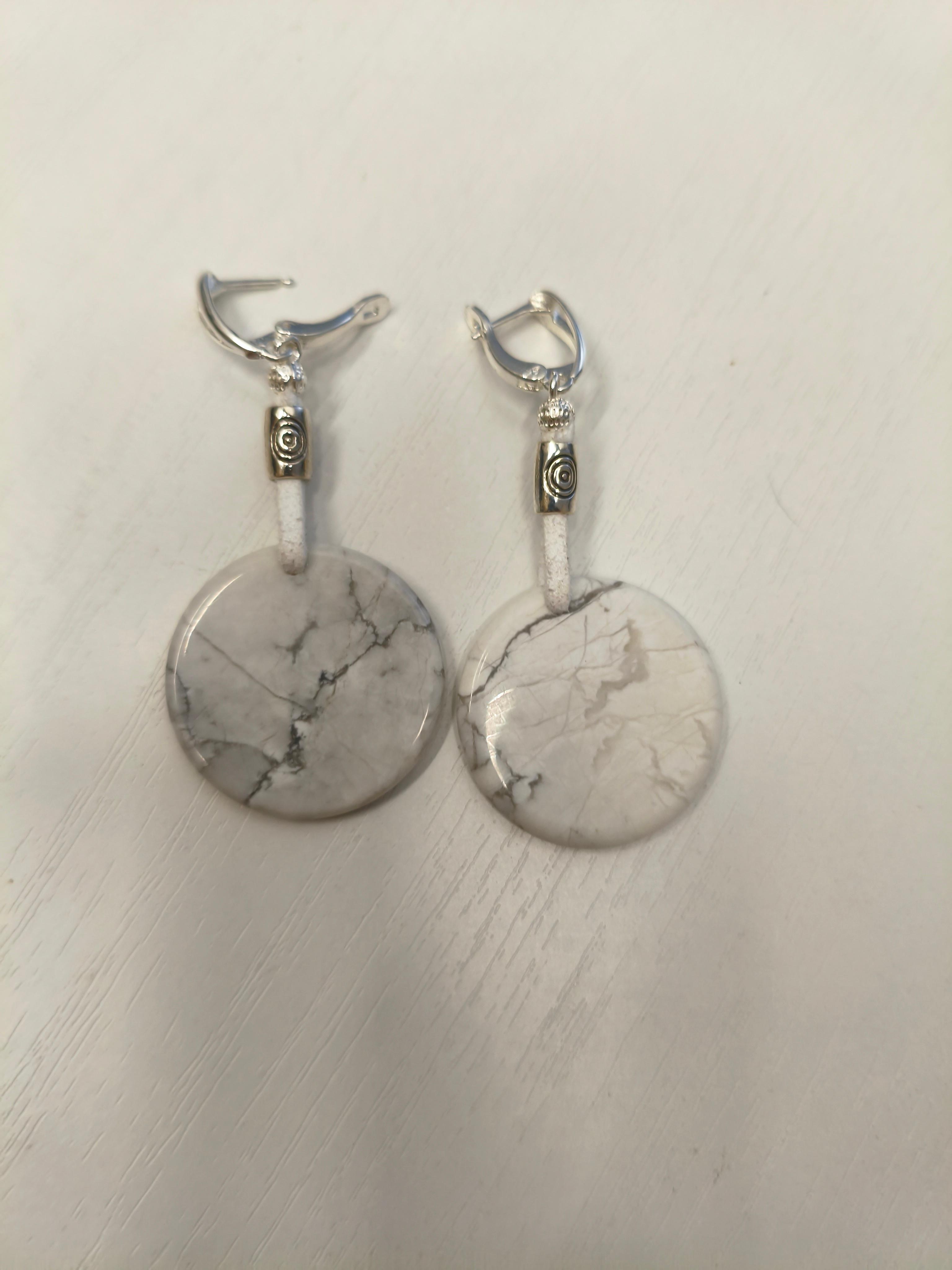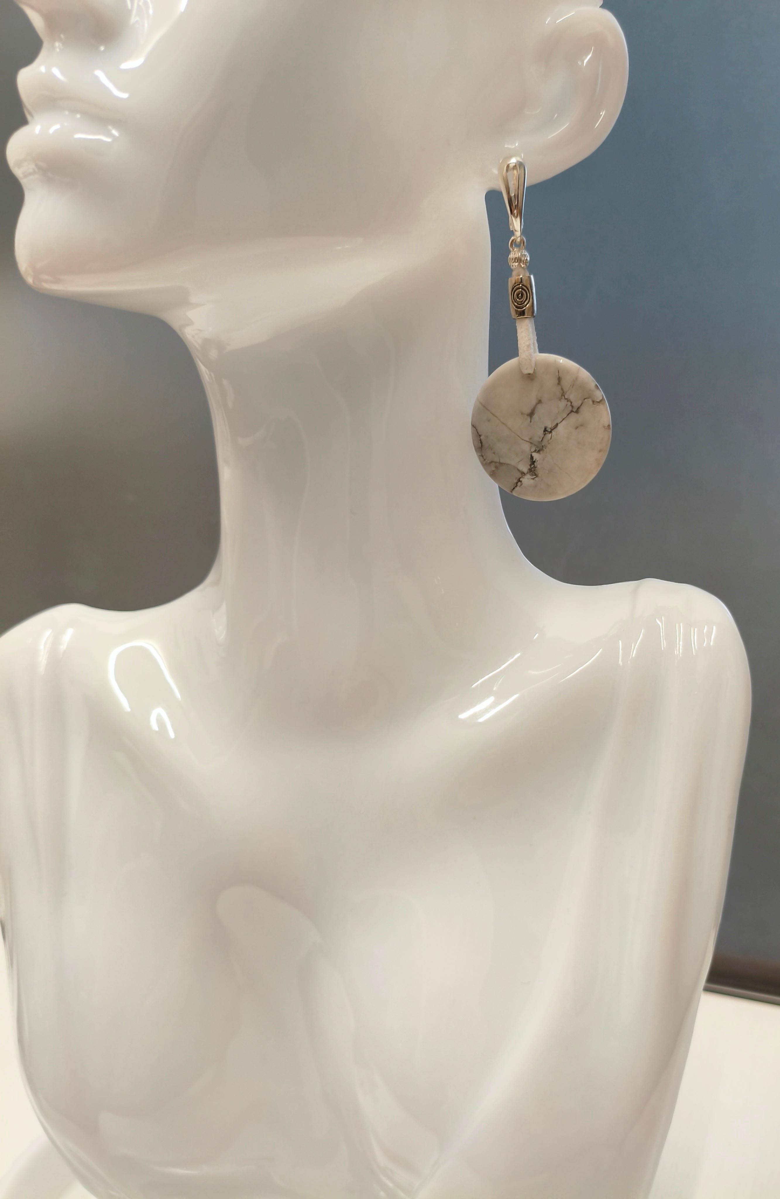 Бирюза белая натуральный камень ф 30 мм + кожа/замша + фурнитура ювелирный сплав цвет серебро Длина серьги без швензы 5 см