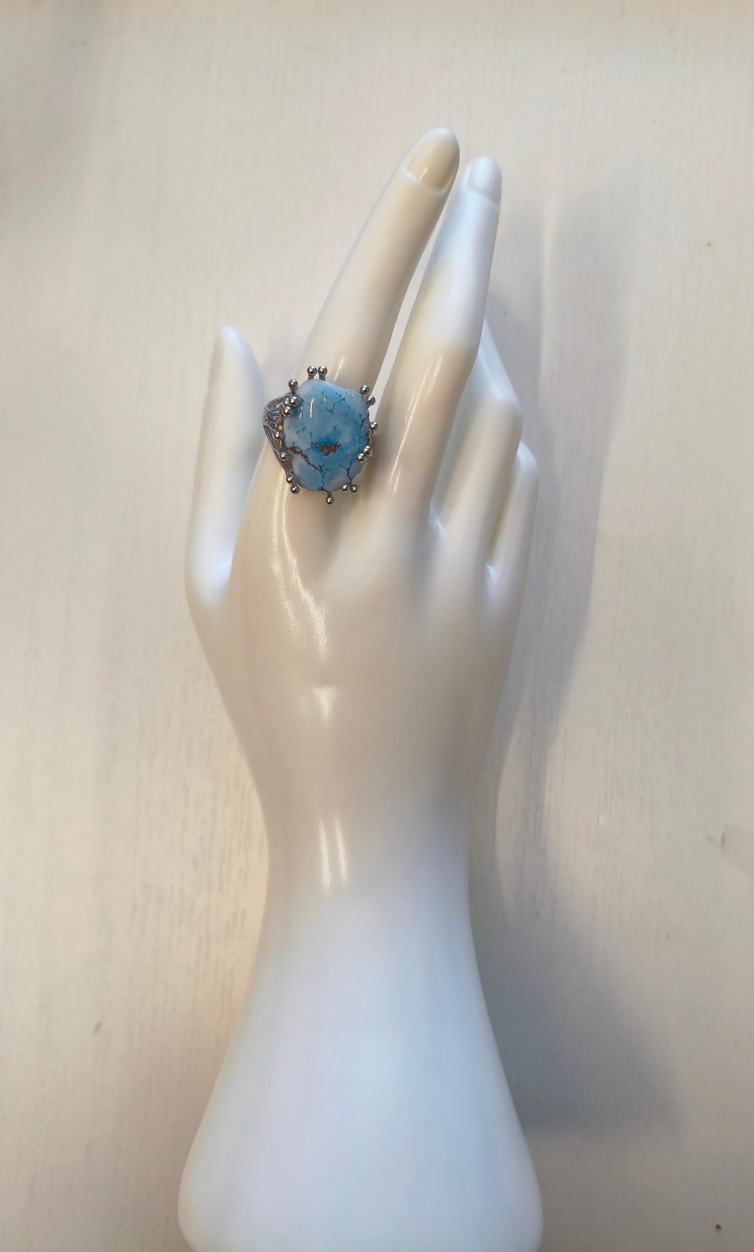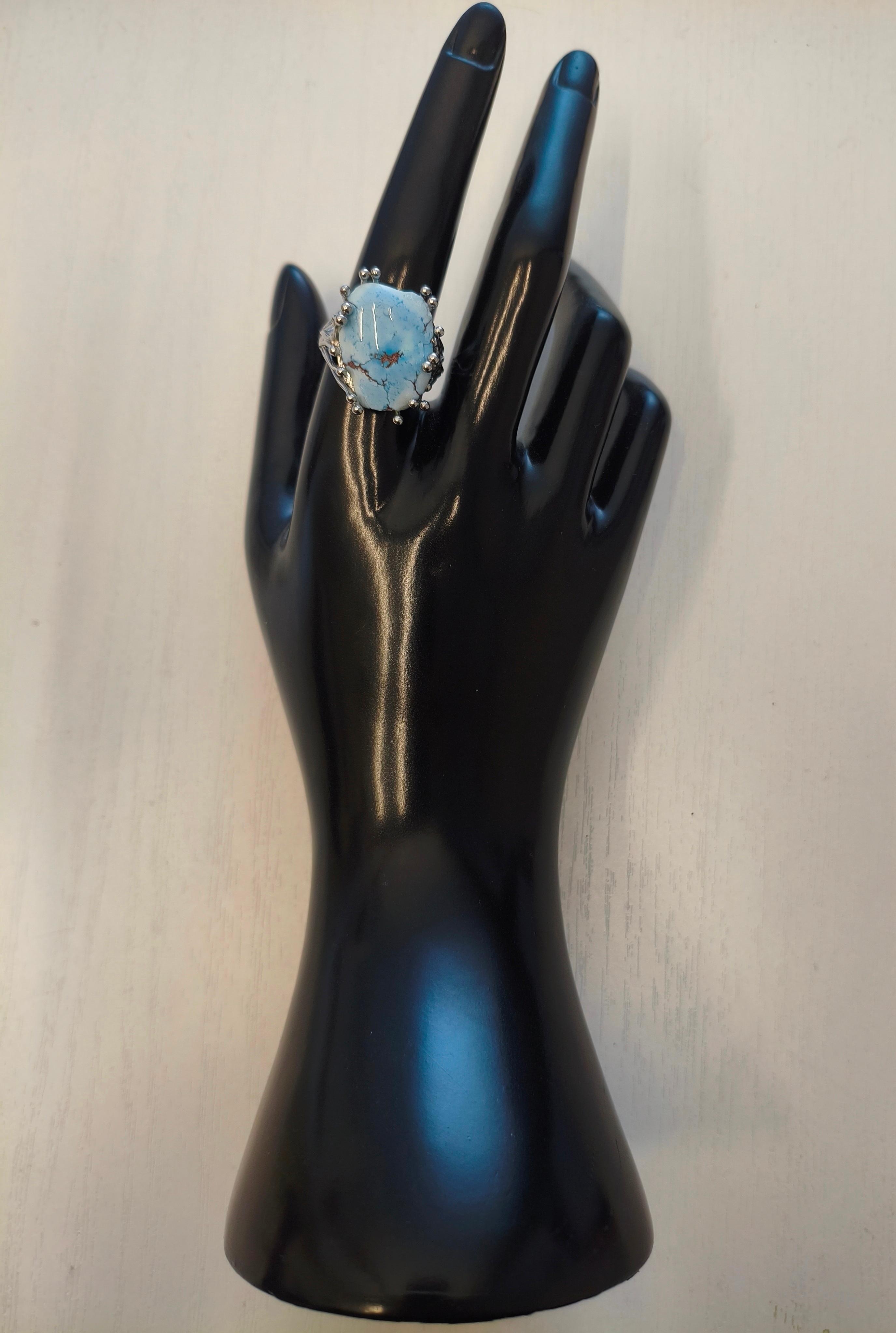 Кольцо «Бирюза светлая» Натуральная бирюза (редкий цвет) 20,7*16*4,5 мм мм /безразмерное/латунь – родиевое покрытие S925 #значение Голубая бирюза: мир, доверие, исцеление, укрепление дружбы и партнёрства.