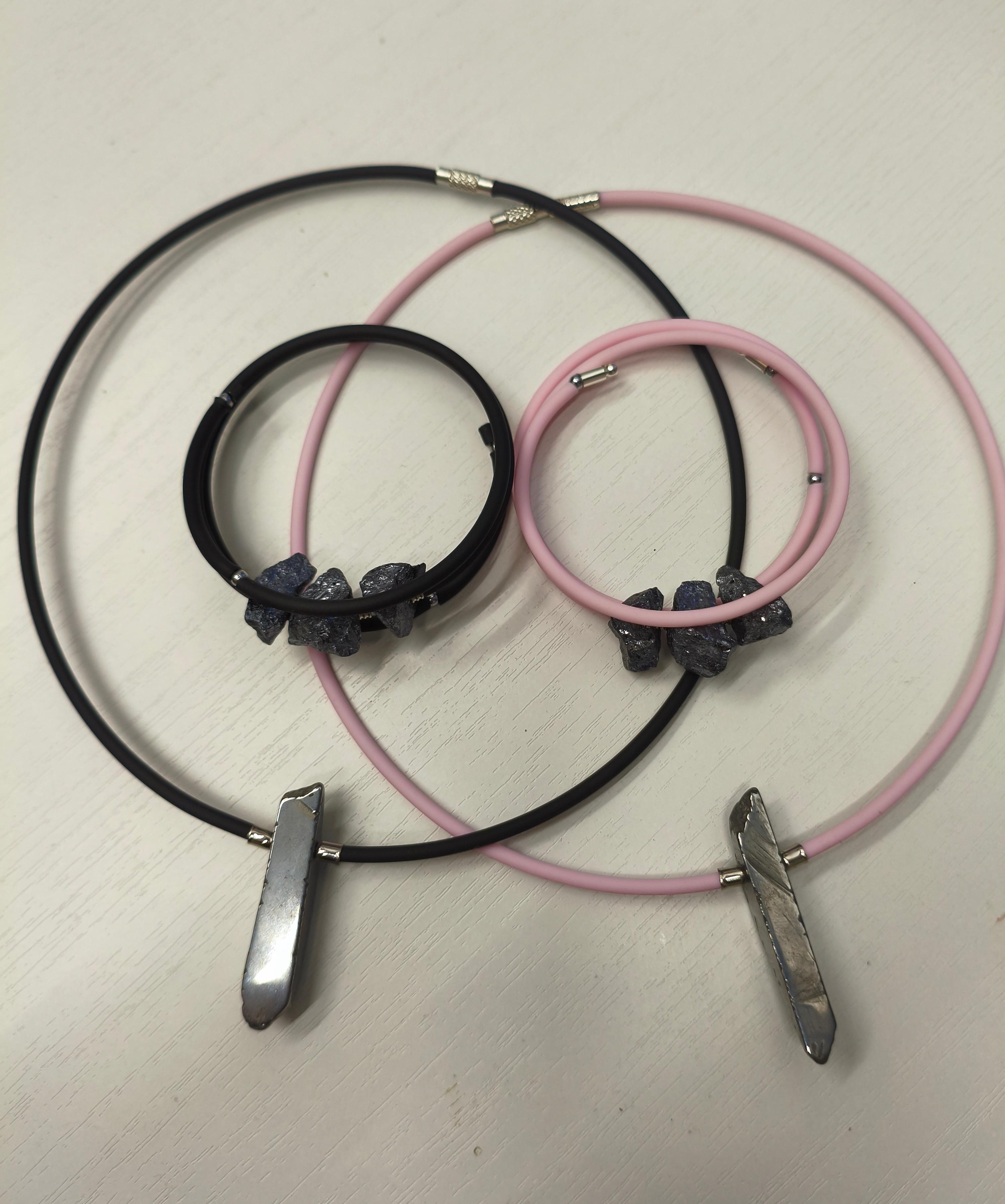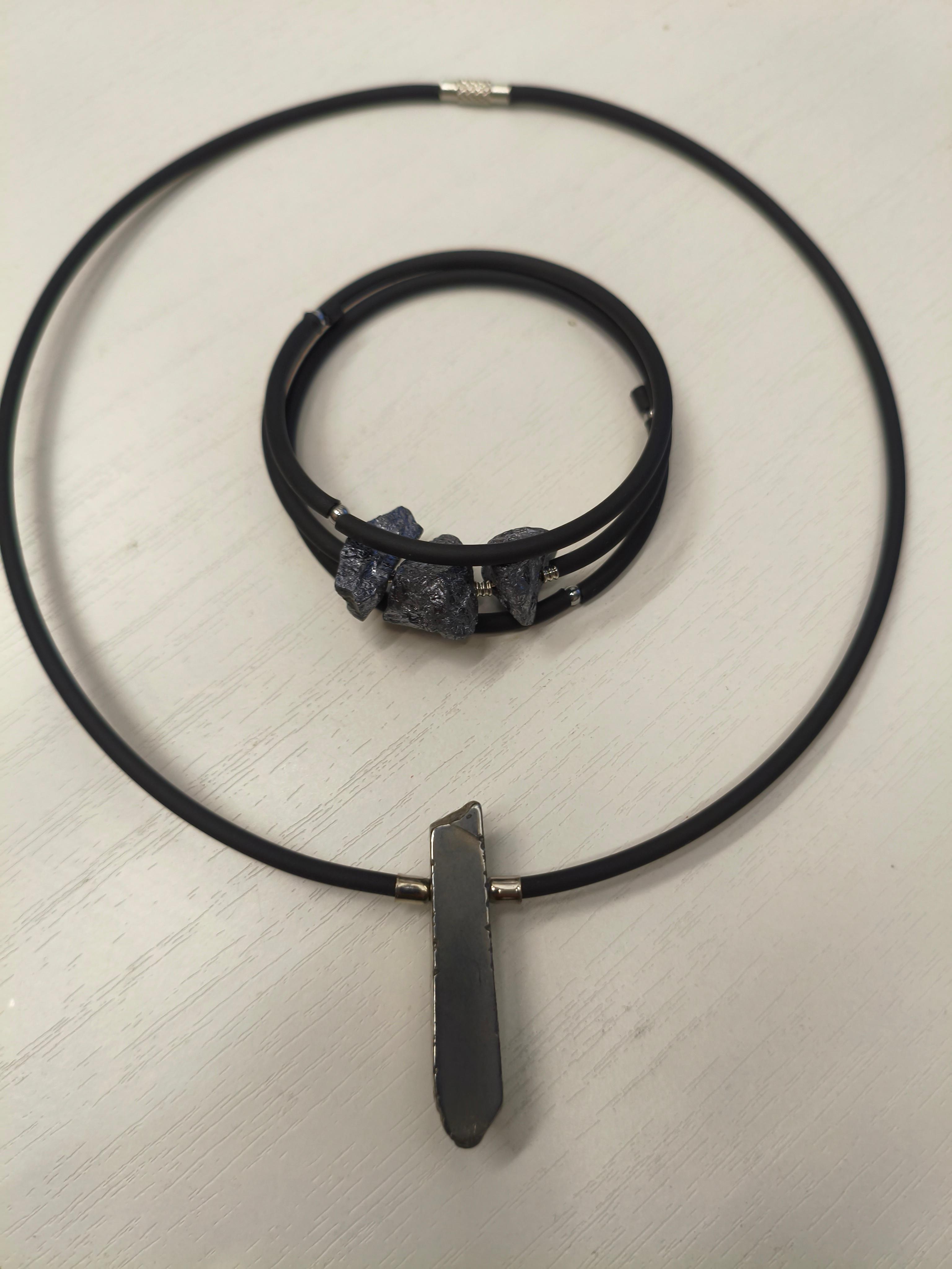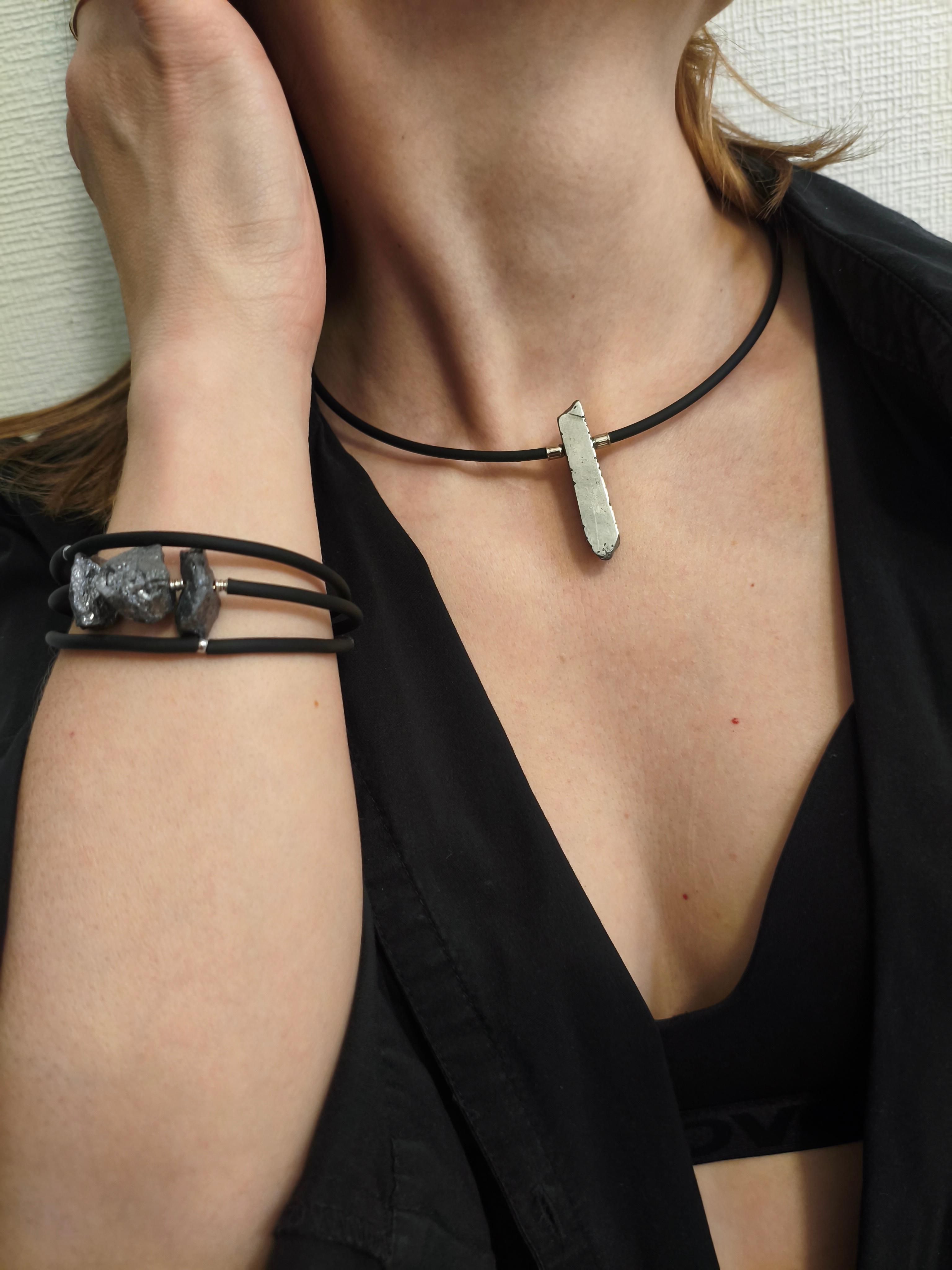 Гематит + черный каучук/застежка-закрутка. Форма жесткая. Унисекс. Подходит в комплект с браслетом "Черная грань" Можно использовать, как вариант «для него» и «для нее» с чокером/браслетом с розовым каучуком ⭕️Гематит: защита, заземление, сила воли, восстановление энергии, помощь при стрессе.