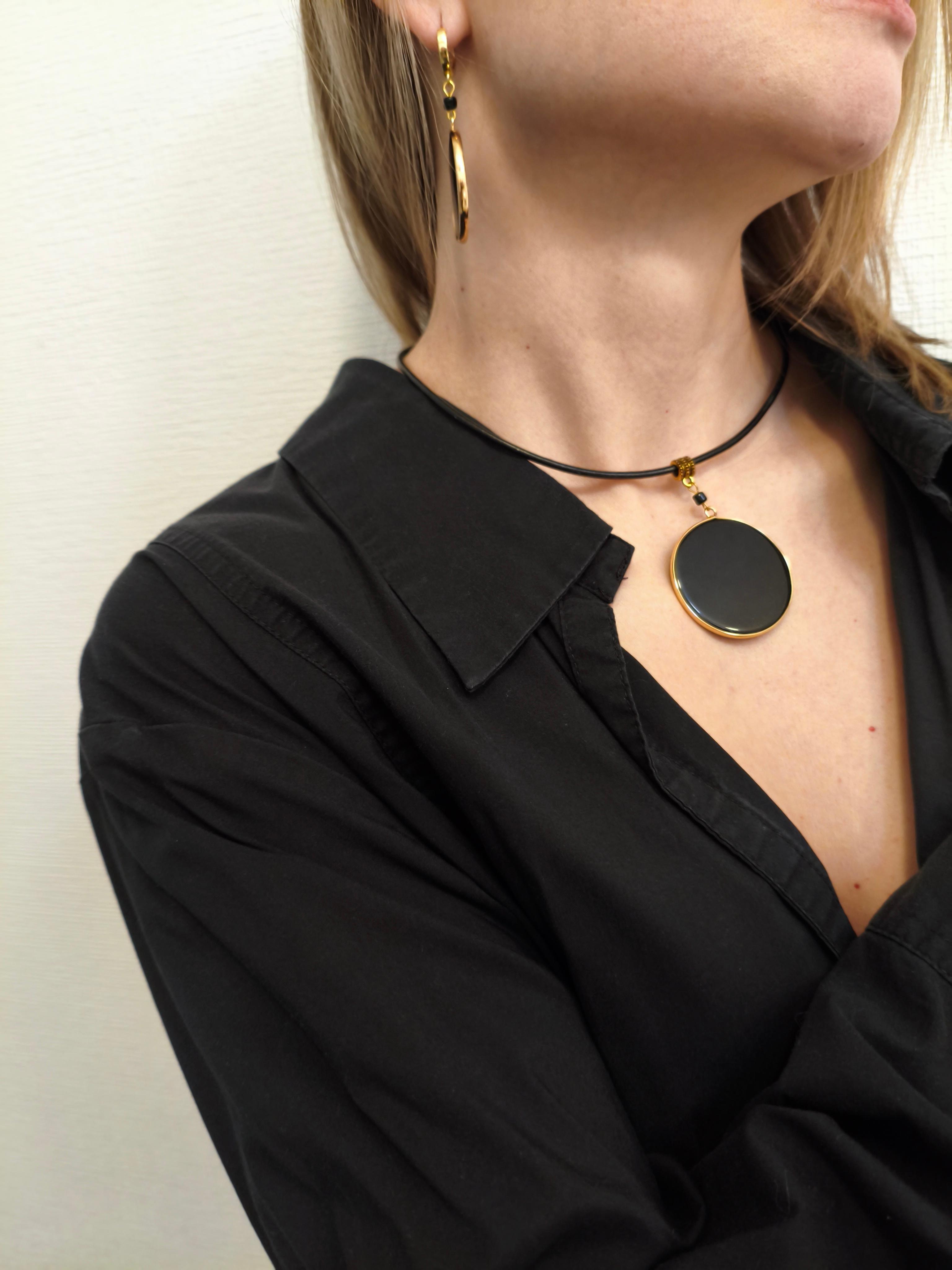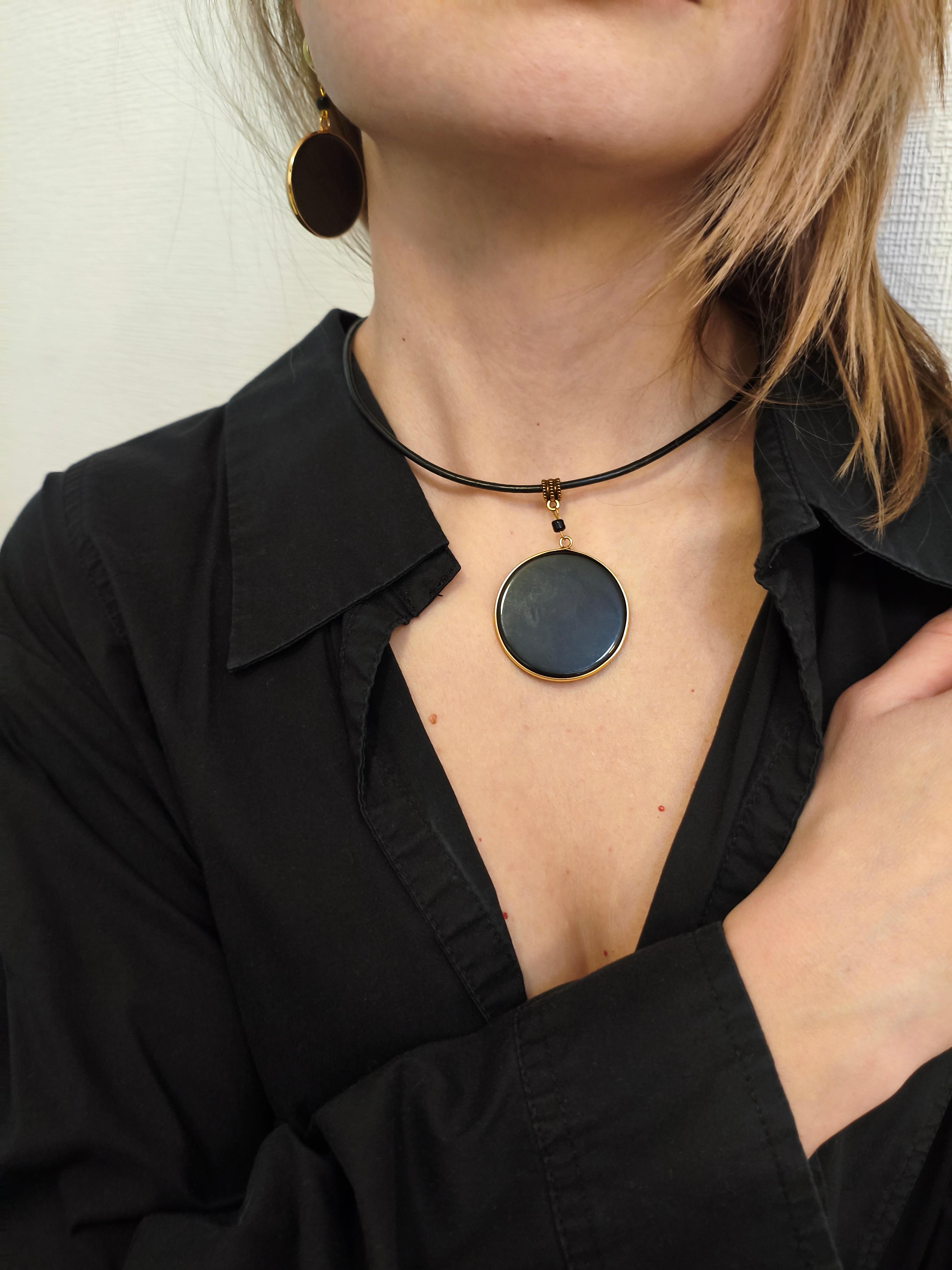 Стекло черное ф 40 мм в металлической оправе по окружности / шнур кожа 3 мм/цвет фурнитуры золото. Длина кулона 70 мм. Длина чокера 42-47 см/цепочка + замок-карабин. Кулон съемный. С серьгами "Черная метка" образует комплект