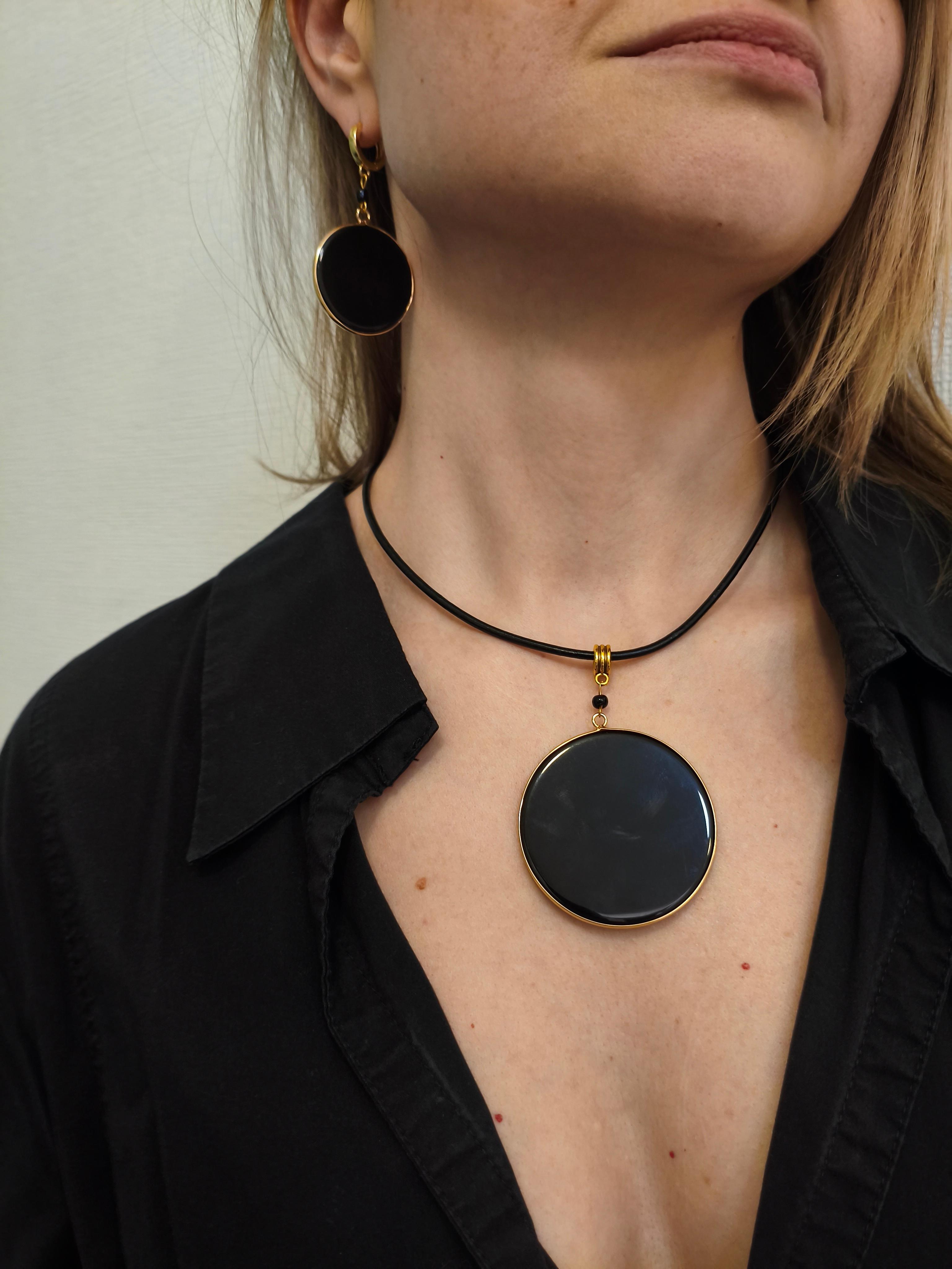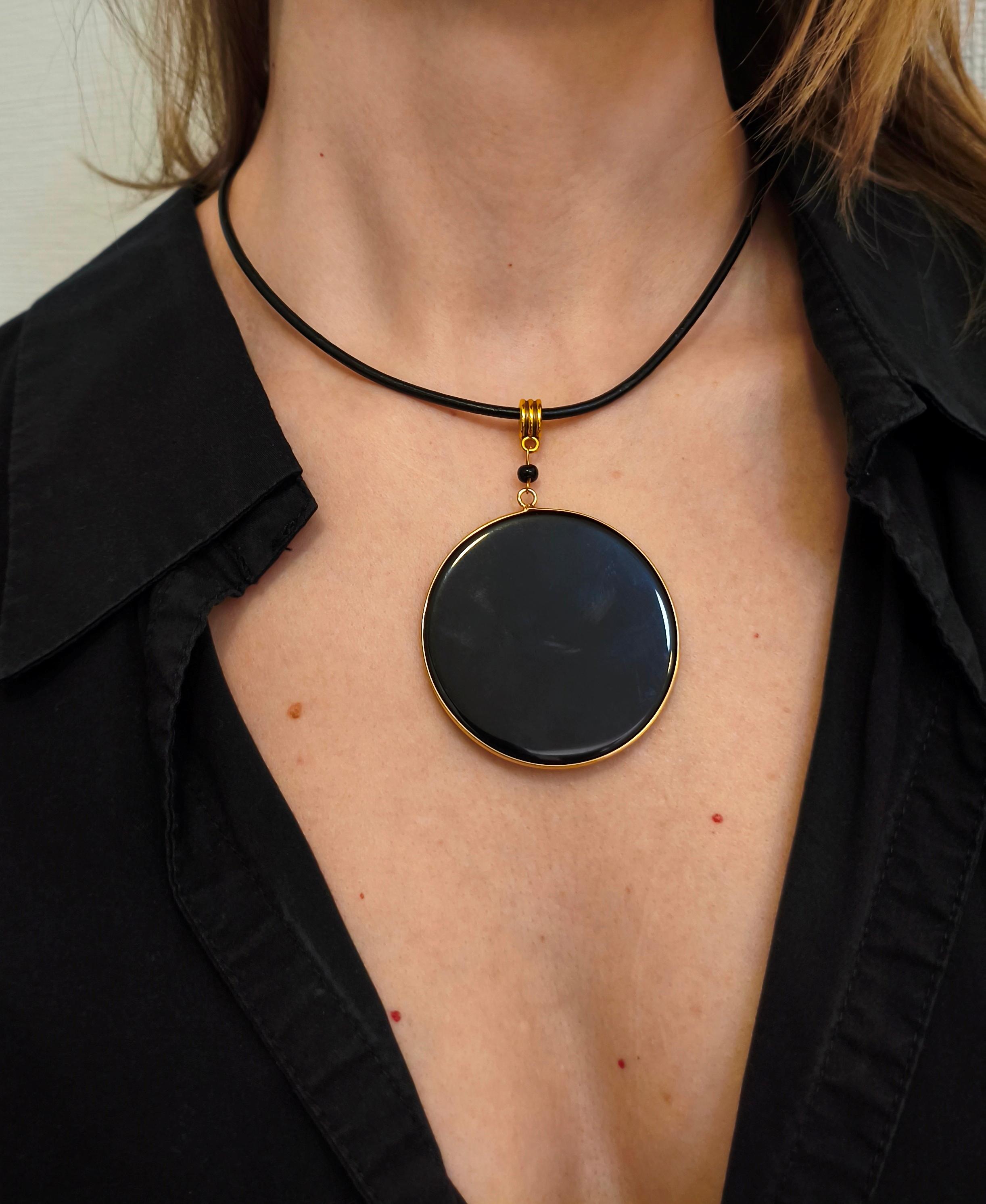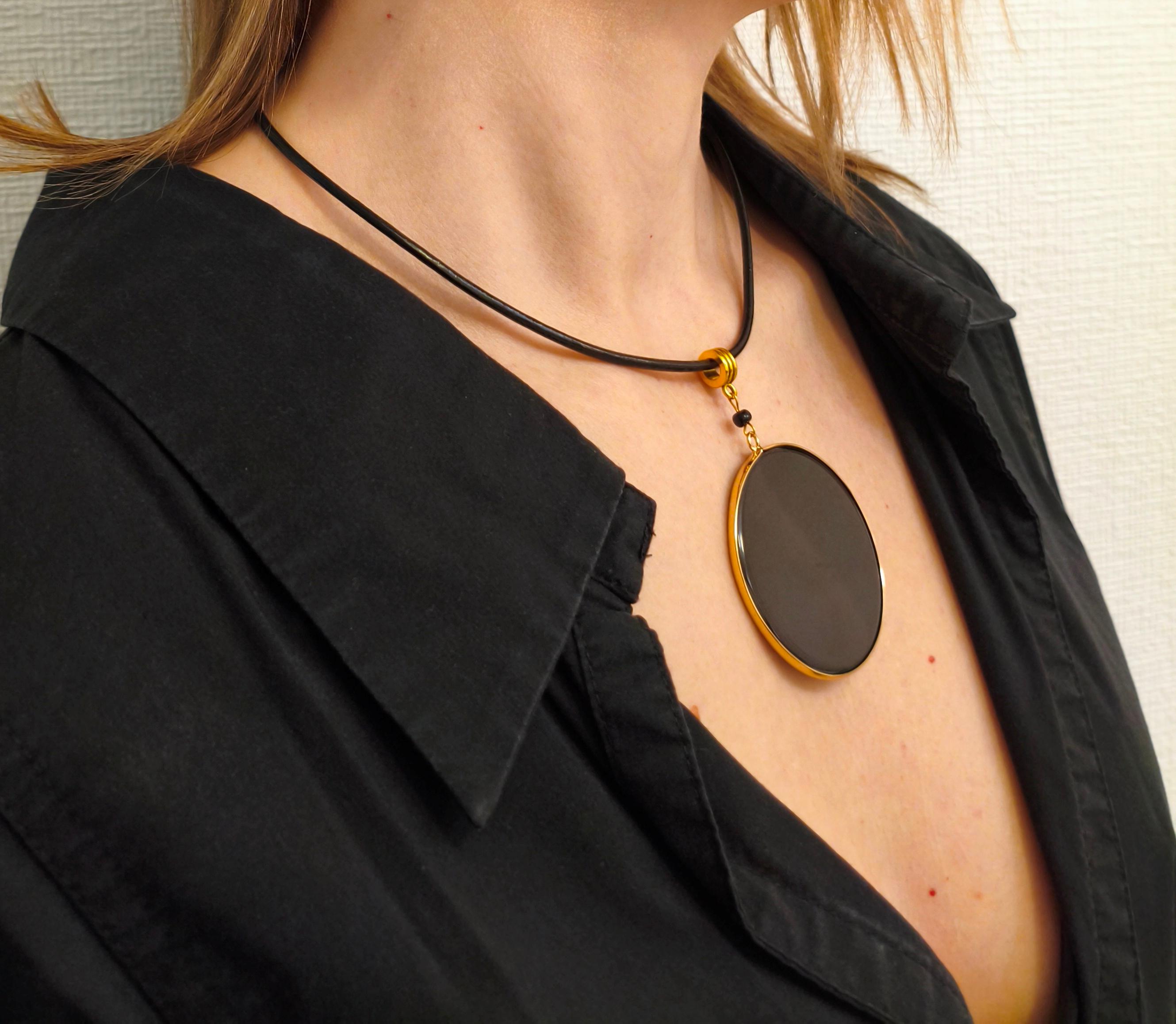 Стекло черное ф 50 мм в металлической оправе по окружности / шнур кожа 3 мм/цвет фурнитуры золото. Длина кулона 70 мм. Длина чокера 42-47 см/цепочка + замок-карабин. Кулон съемный. С серьгами "Черная метка" образует комплект