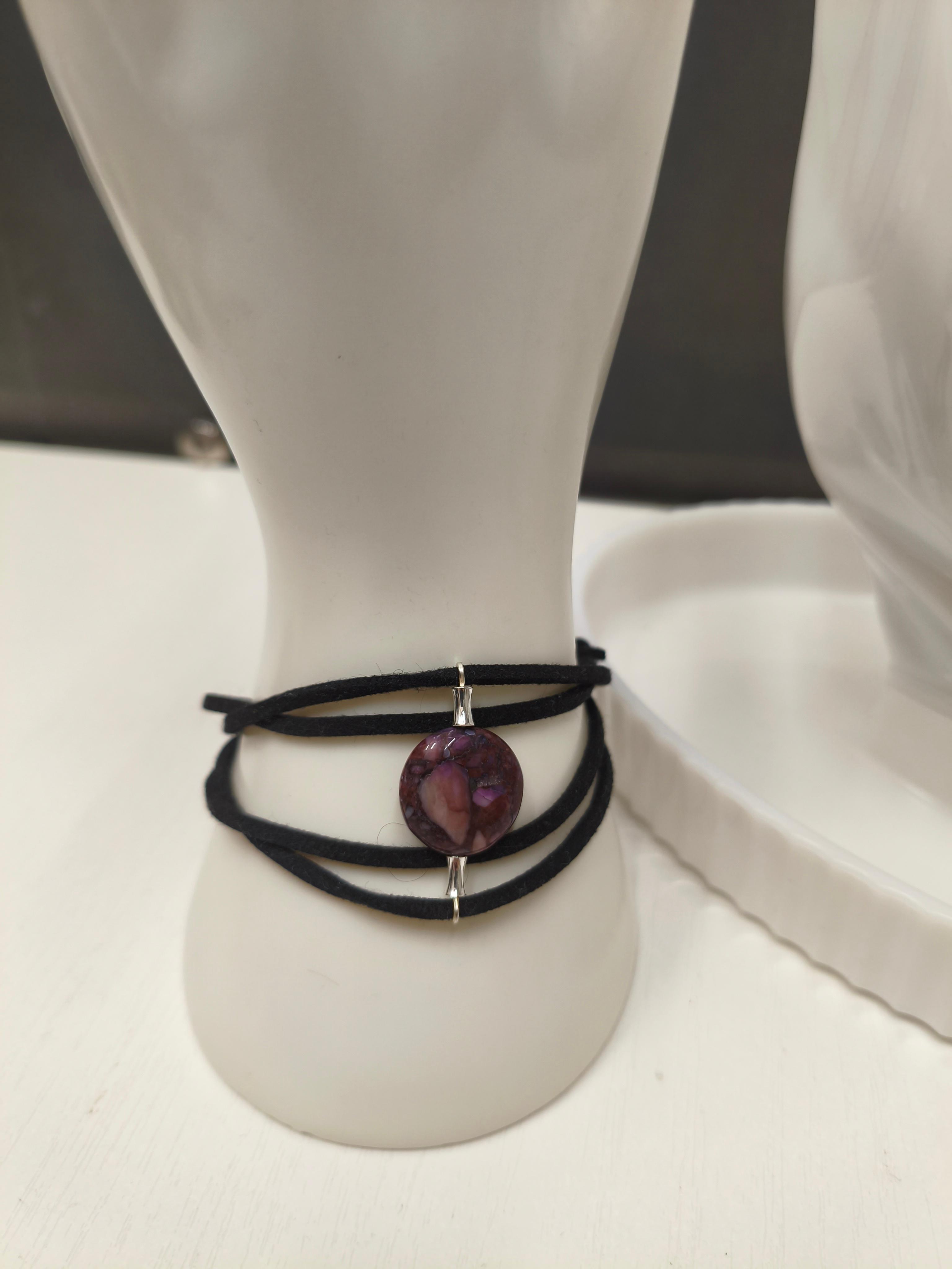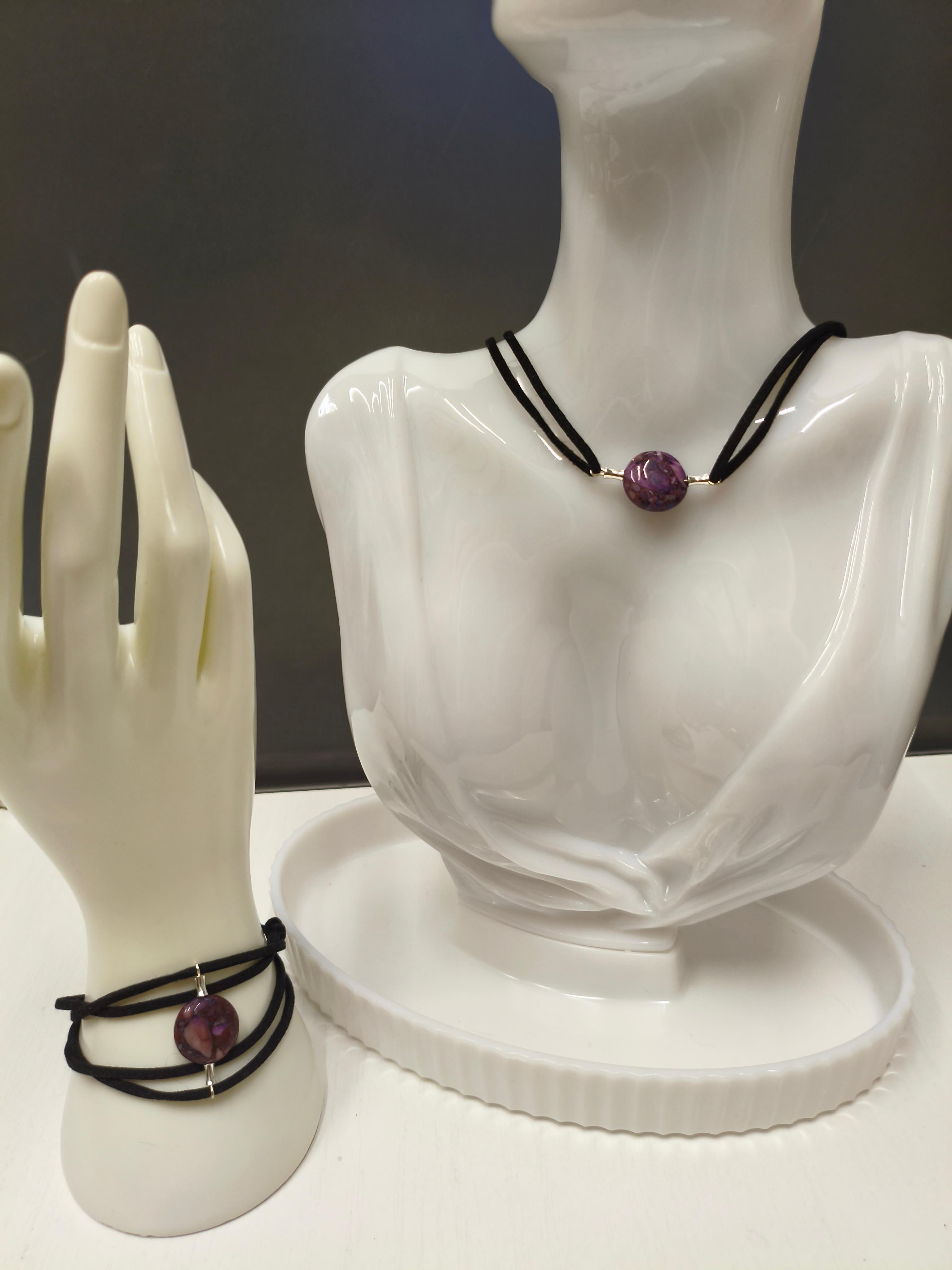 Колье с натуральным чароитом ф15мм + кожа плоская/замша черная + фурнитура цвет серебро/юв. покрытие/ замок-карабин с цепочкой удлинителем. Тип чокер 42 - 47.5 см Браслет с натуральным чароитом ф15мм + кожа плоская/замша черная + фурнитура цв: серебро/юв.покрытие - замок магнитный 20 см ‼️ Возможно уменьшить размер в соответствии с запястьем‼️