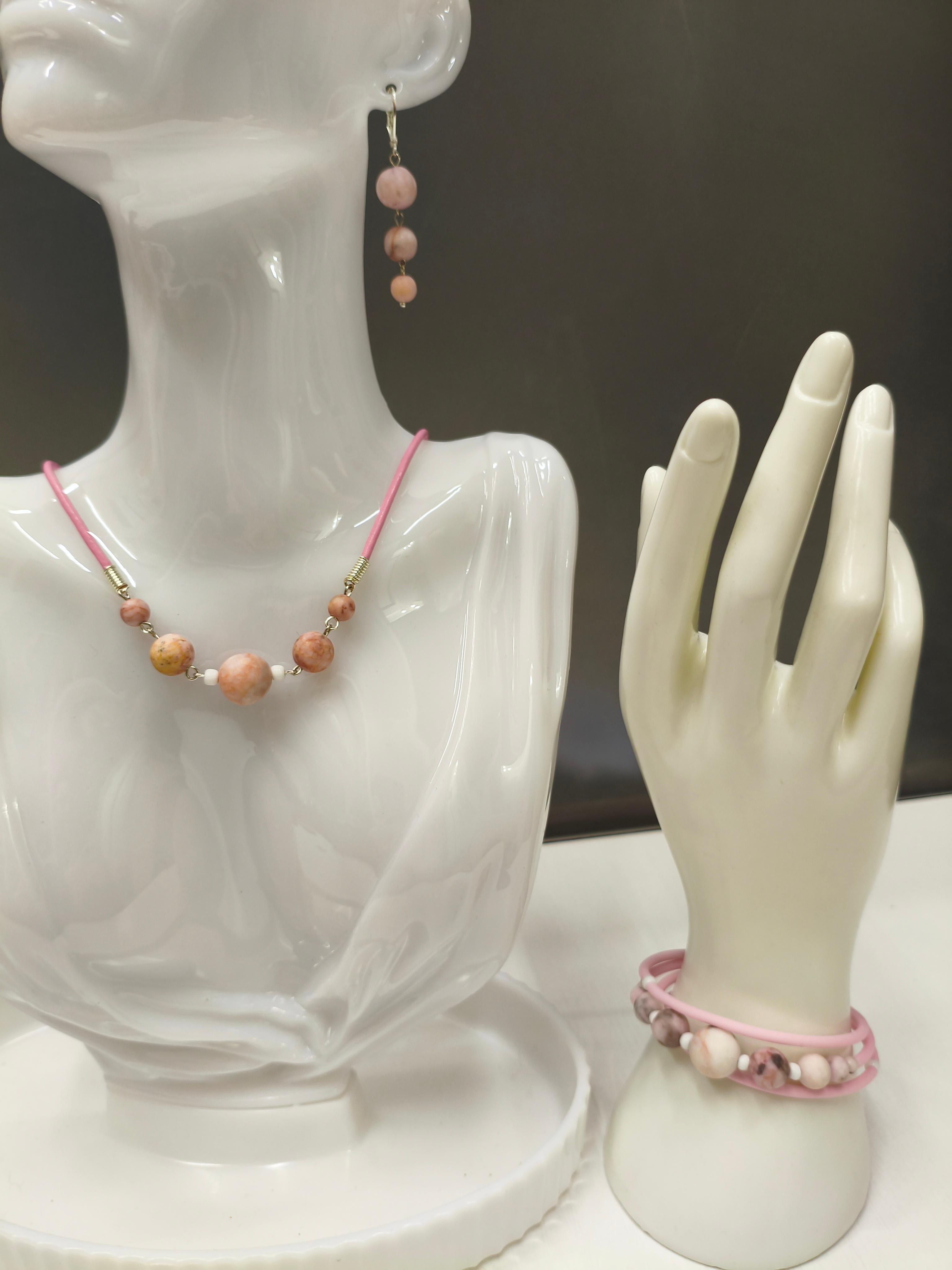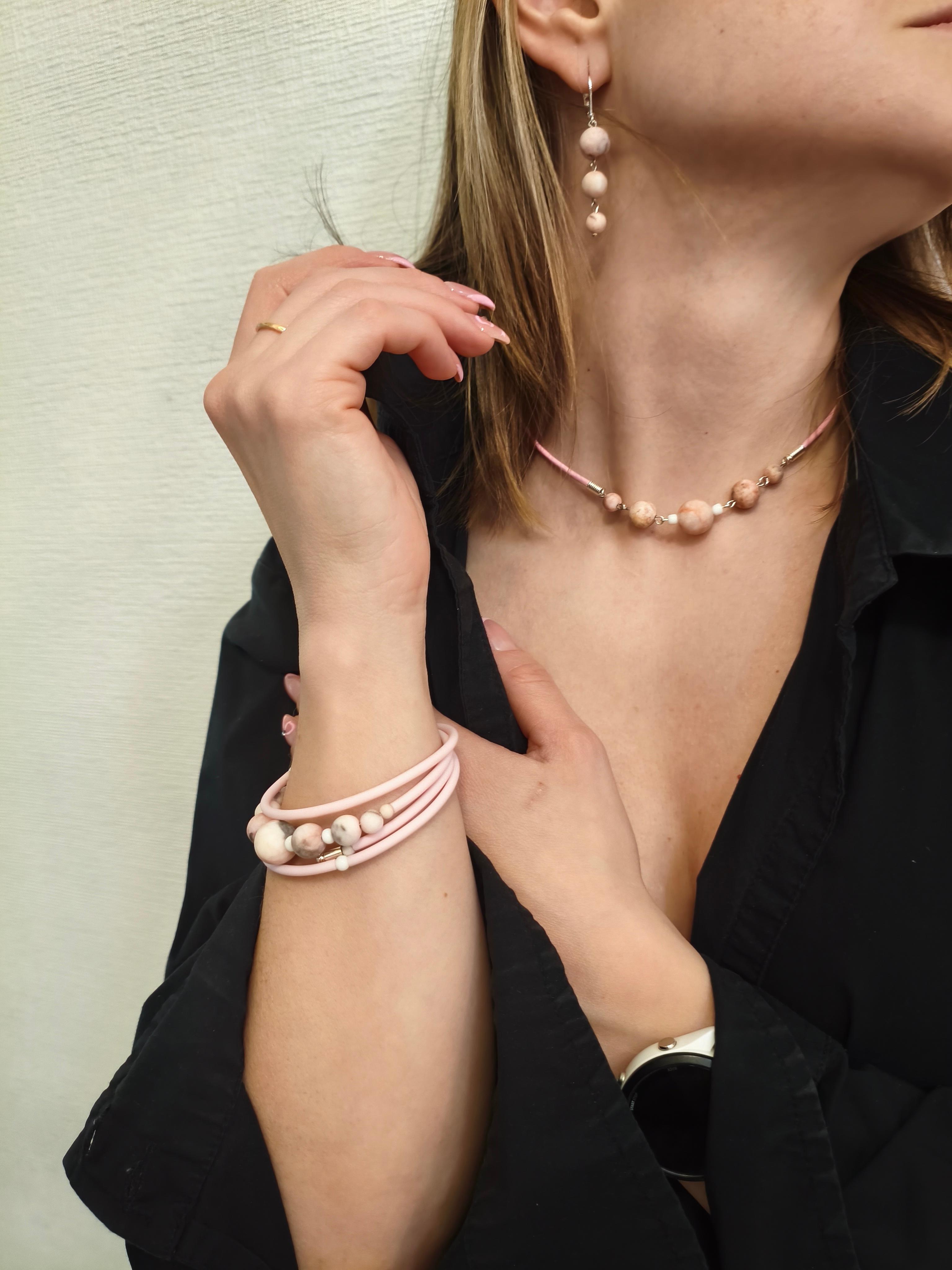 Розовая яшма зебра ф 6/8/10 мм + кожа розовая/фурнитура юв. Сплав цвет серебро. Длина 39-44 мм. Подходит в комплект с серьгами и браслетом "Жимолость" и "Пастила"