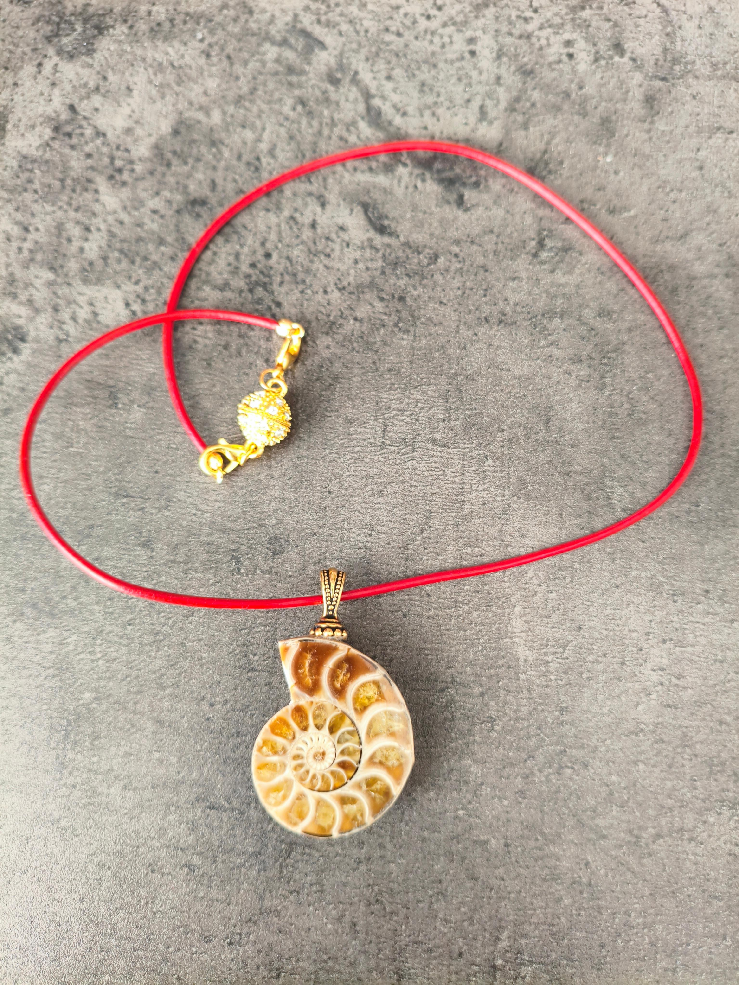 Аммонит на подвесе цвет бронза (латунь) на красном кожаном шнурке + застежка магнит со стразами/золото Многофункциональное применение: подвеска съемная/шнурок можно использовать в качестве браслета