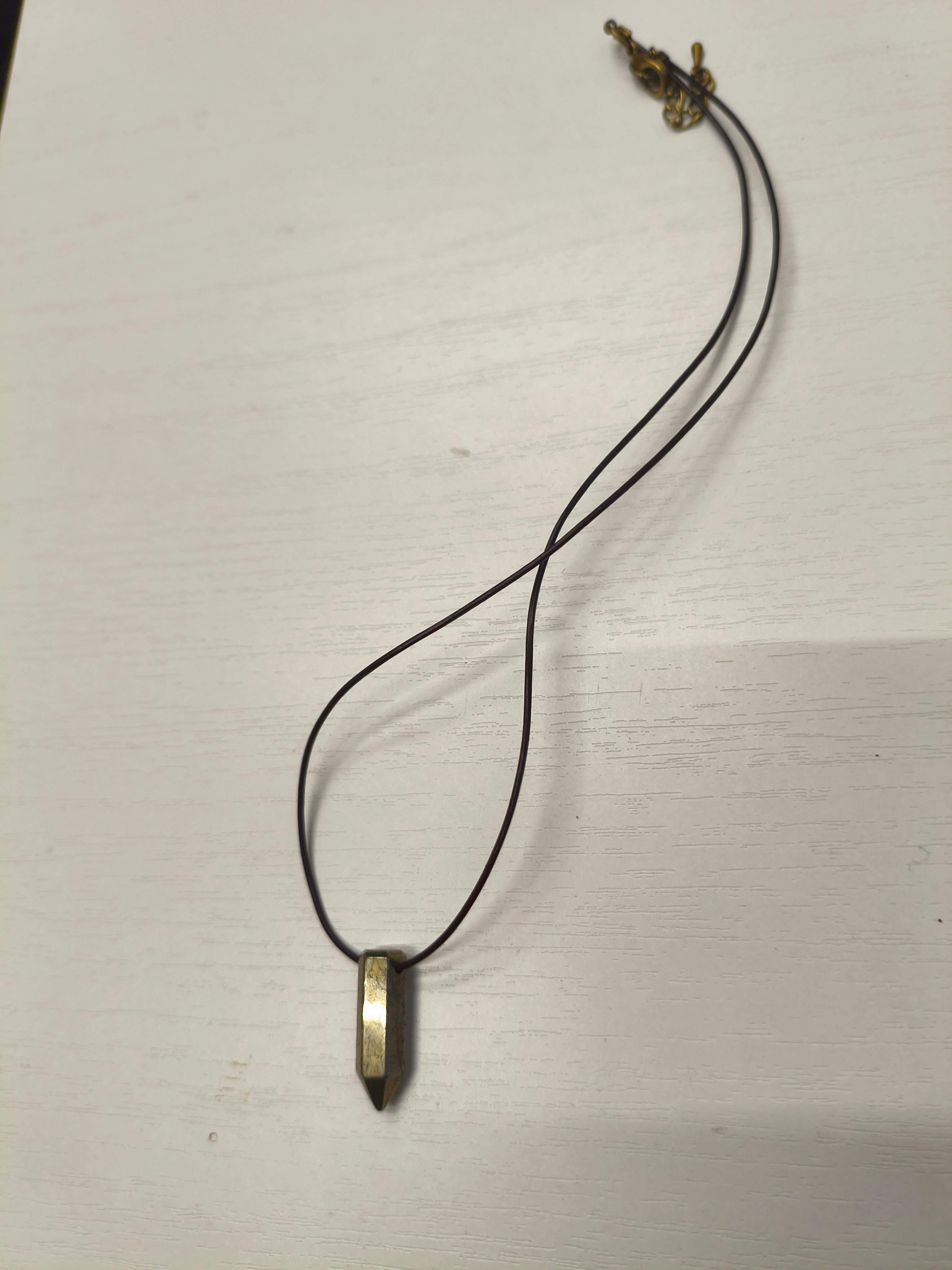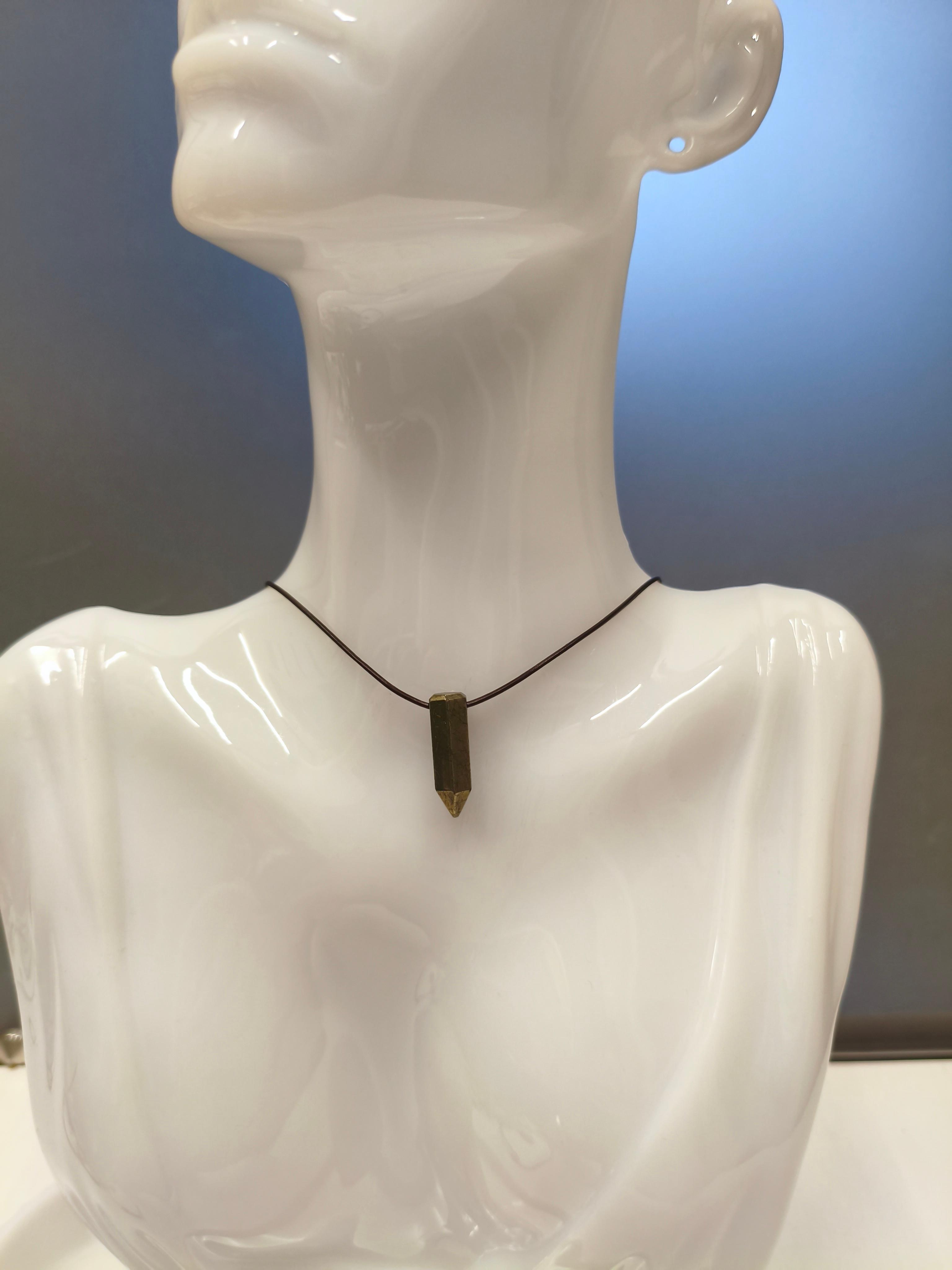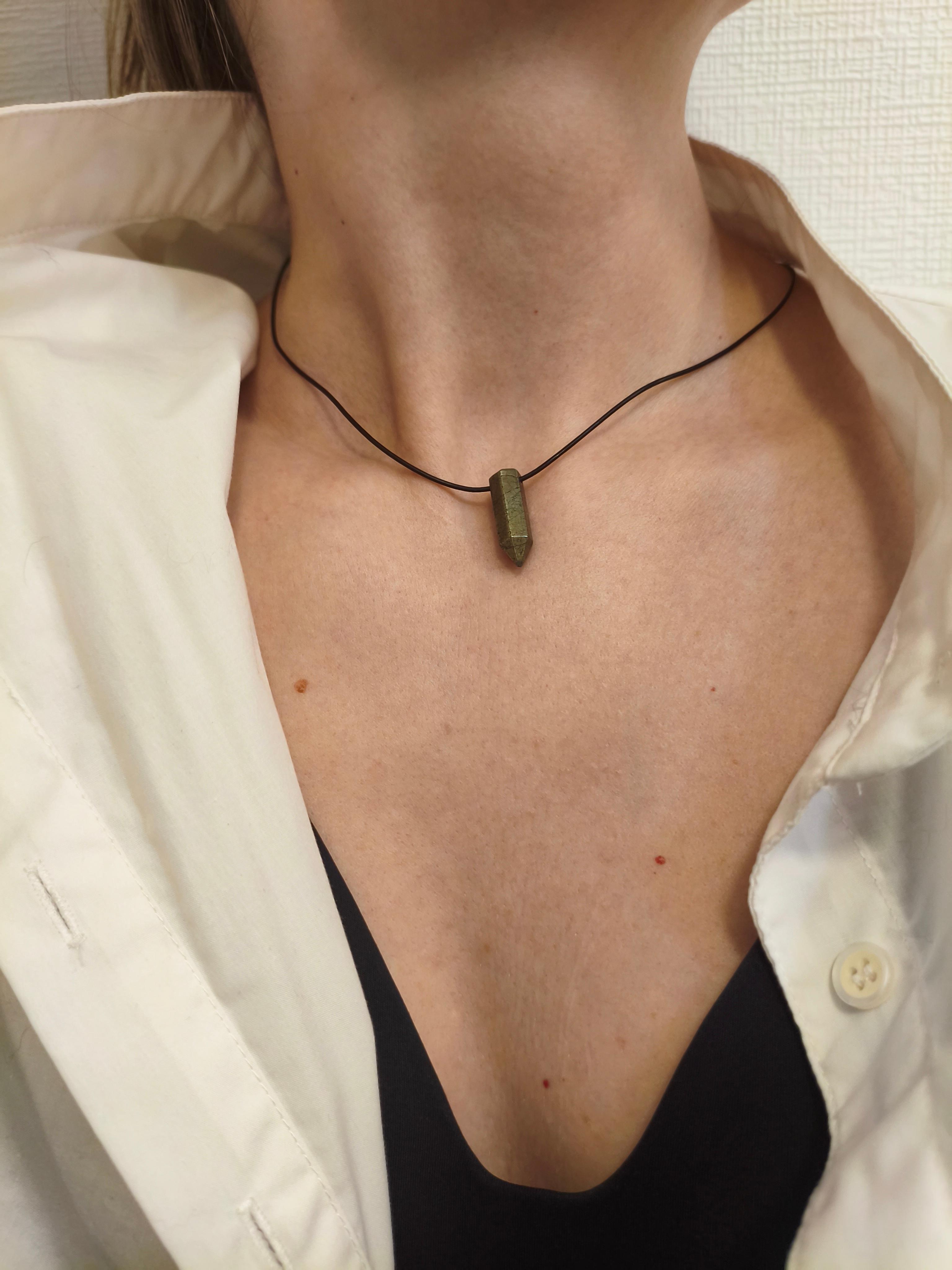Пирит 21*8 мм + кожа толщина 1 мм/фурнитура бронза. Длина 42,5-47 см. Унисекс. Можно использовать, как вариант «для него» и «для нее» с колье «Гильза» Пирит: мужская энергия, храбрость, решительность, привлечение богатства, защита в конфликтах.