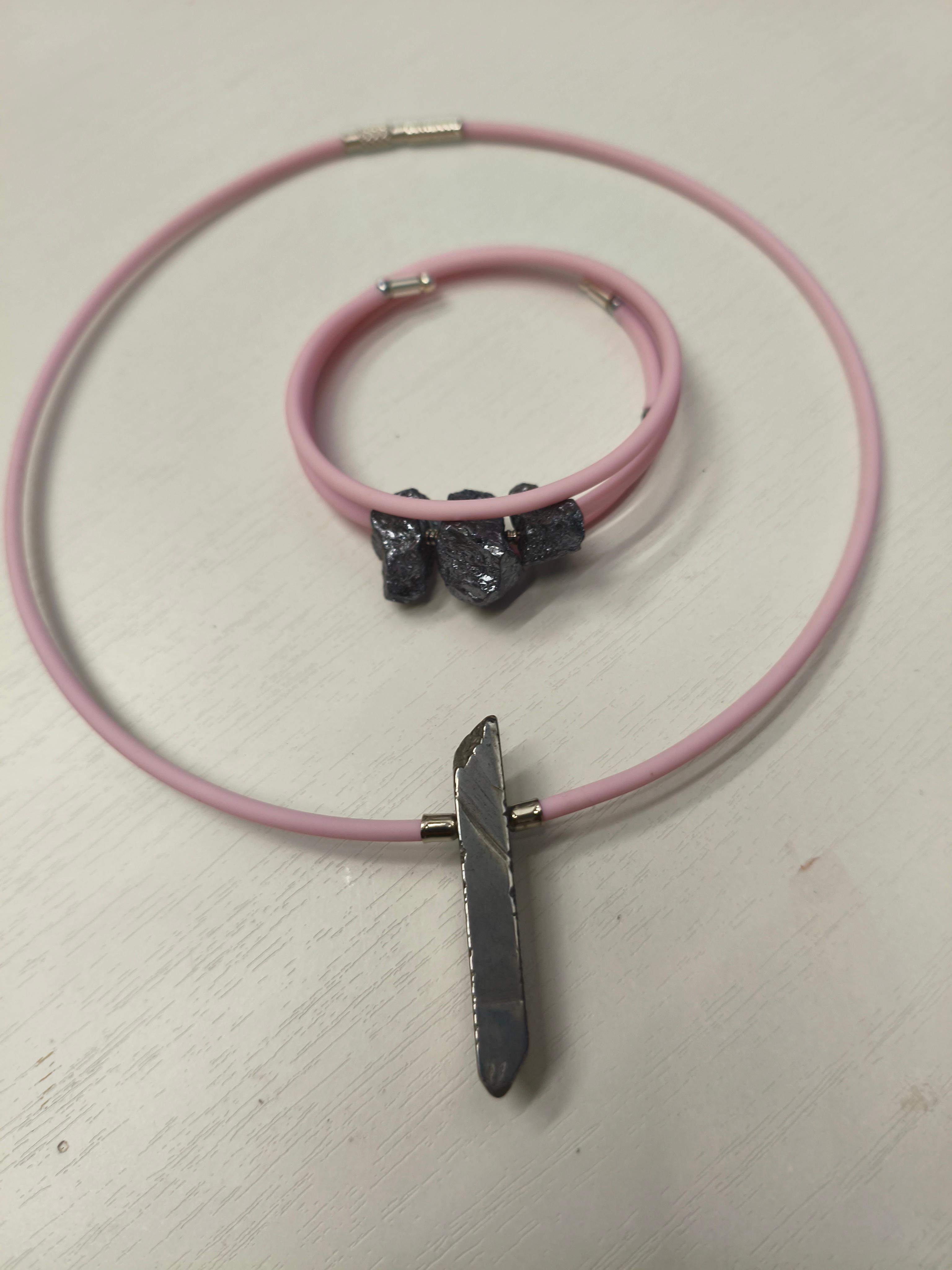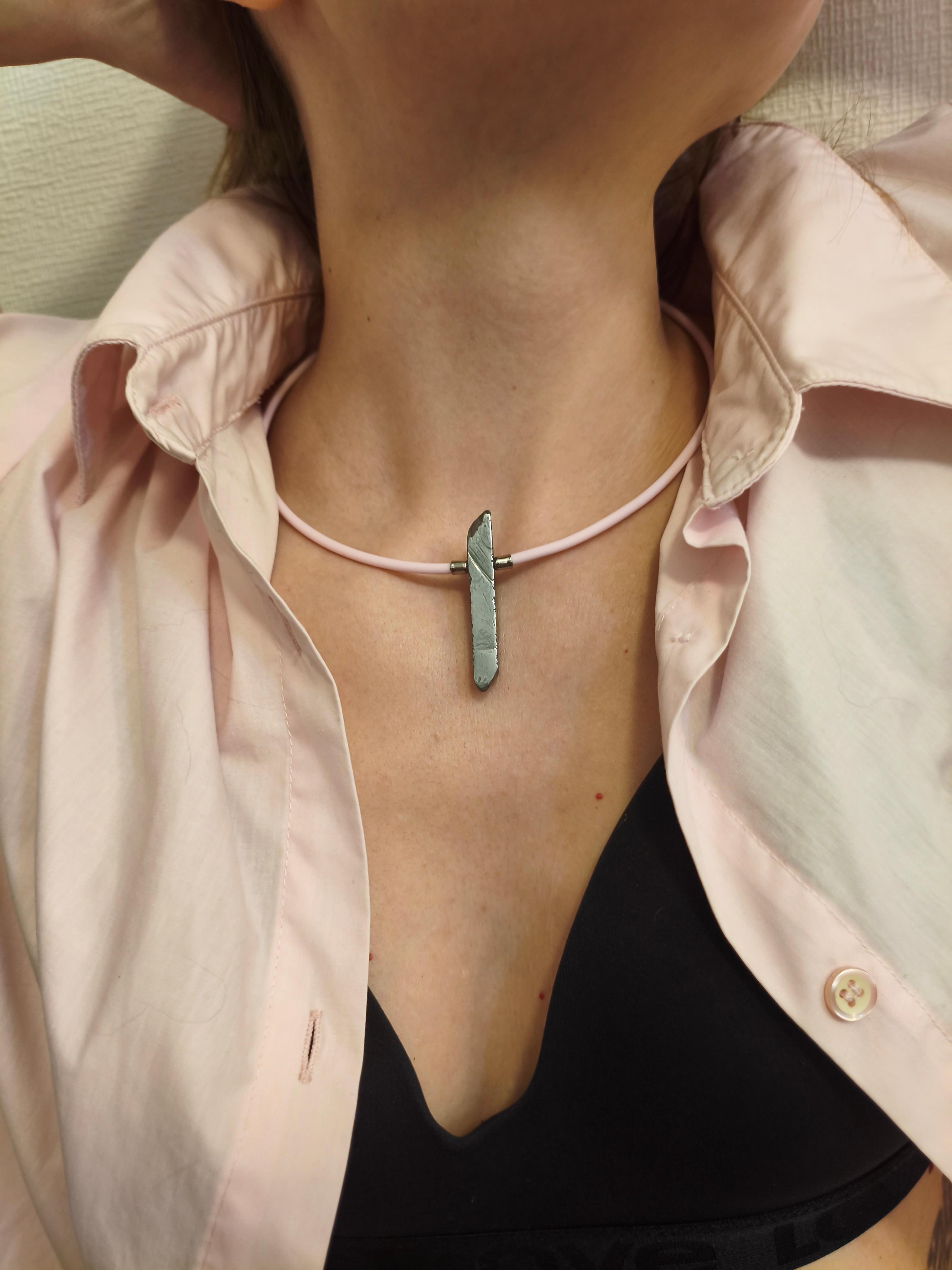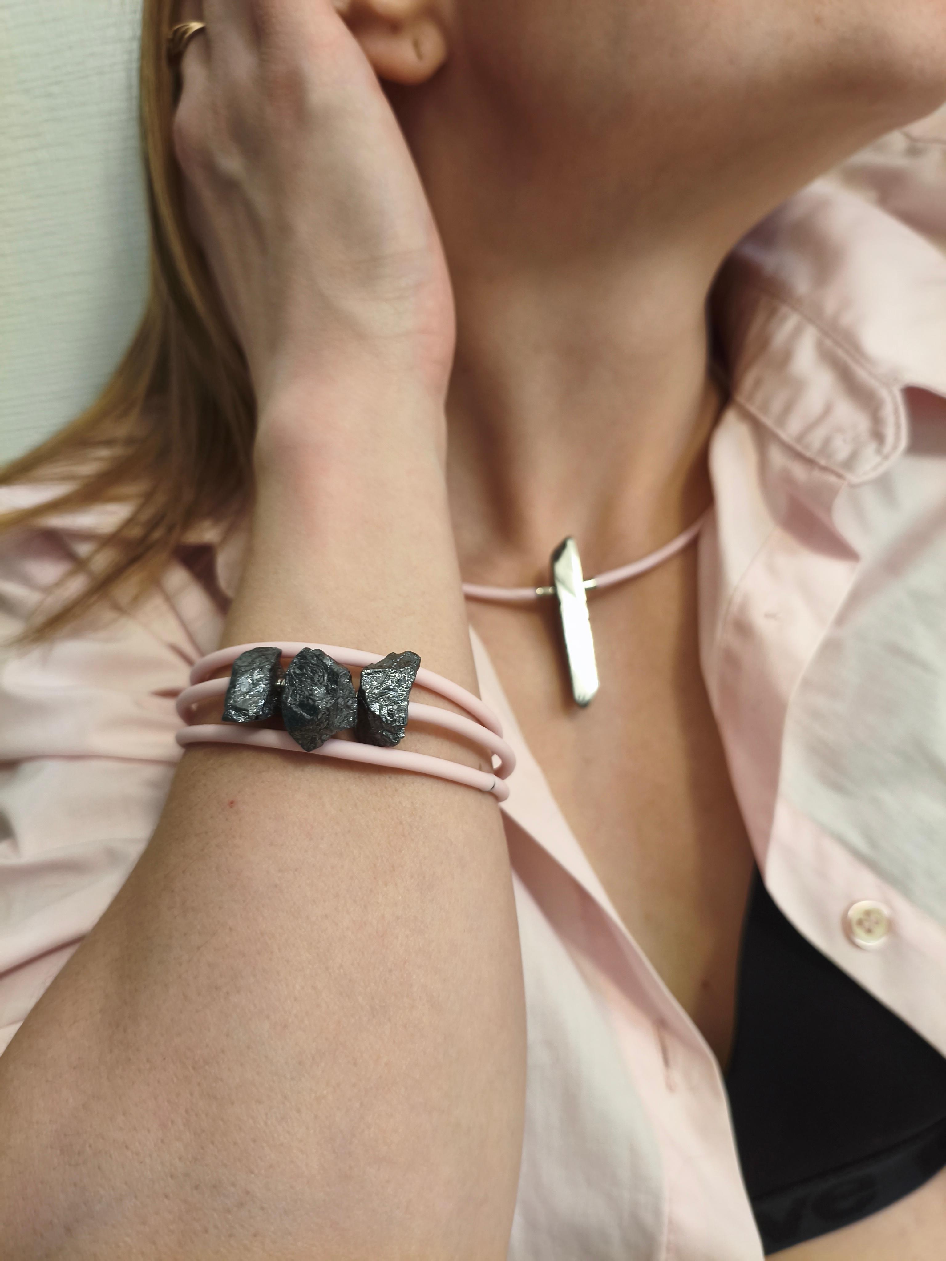 Гематит + розовый каучук/застежка-закрутка. Форма жесткая. Подходит в комплект с браслетом "Розовая грань" Можно использовать, как вариант «для него» и «для нее» с чокером/браслетом с черным каучуком ⭕️Гематит: защита, заземление, сила воли, восстановление энергии, помощь при стрессе.