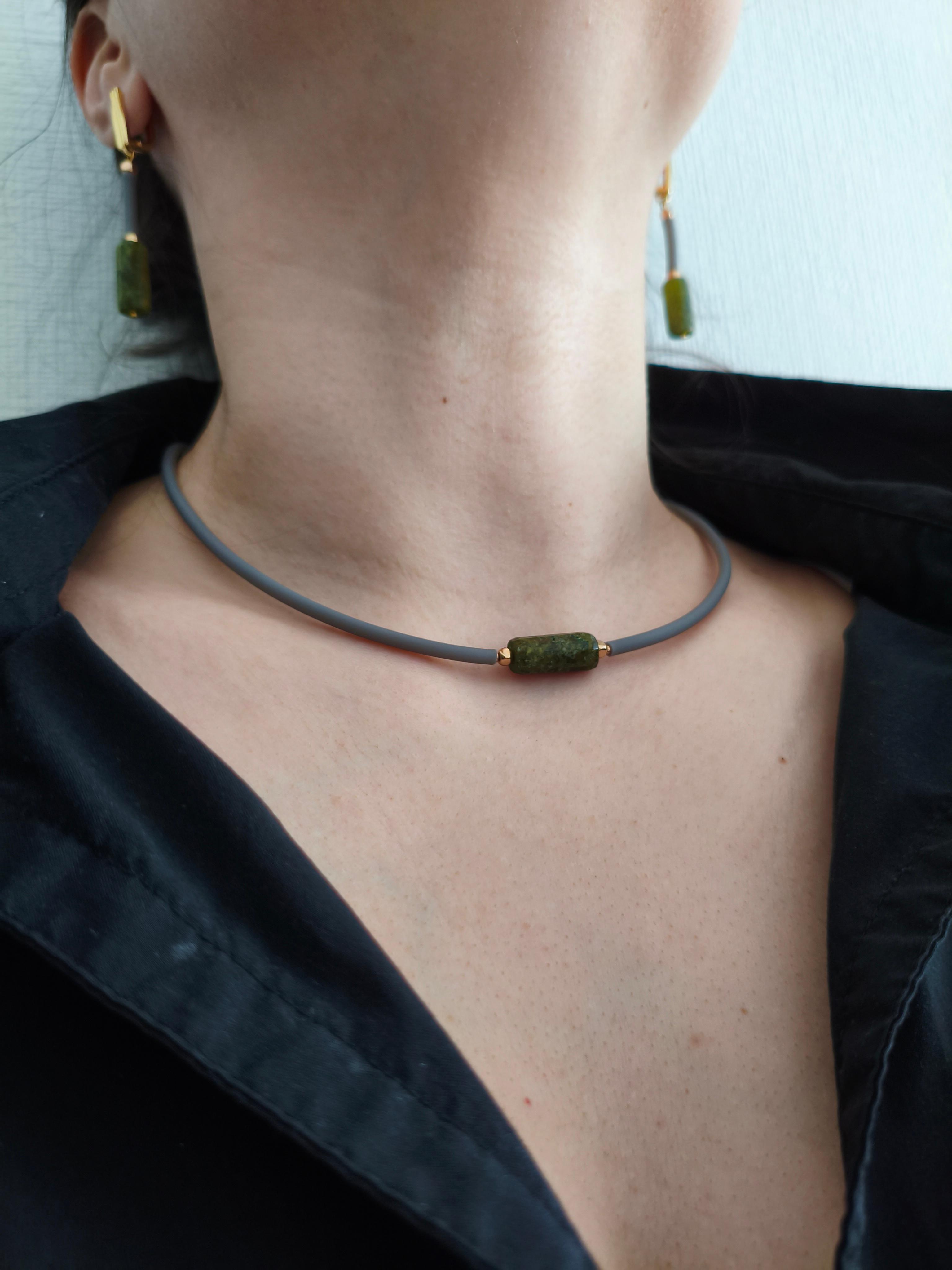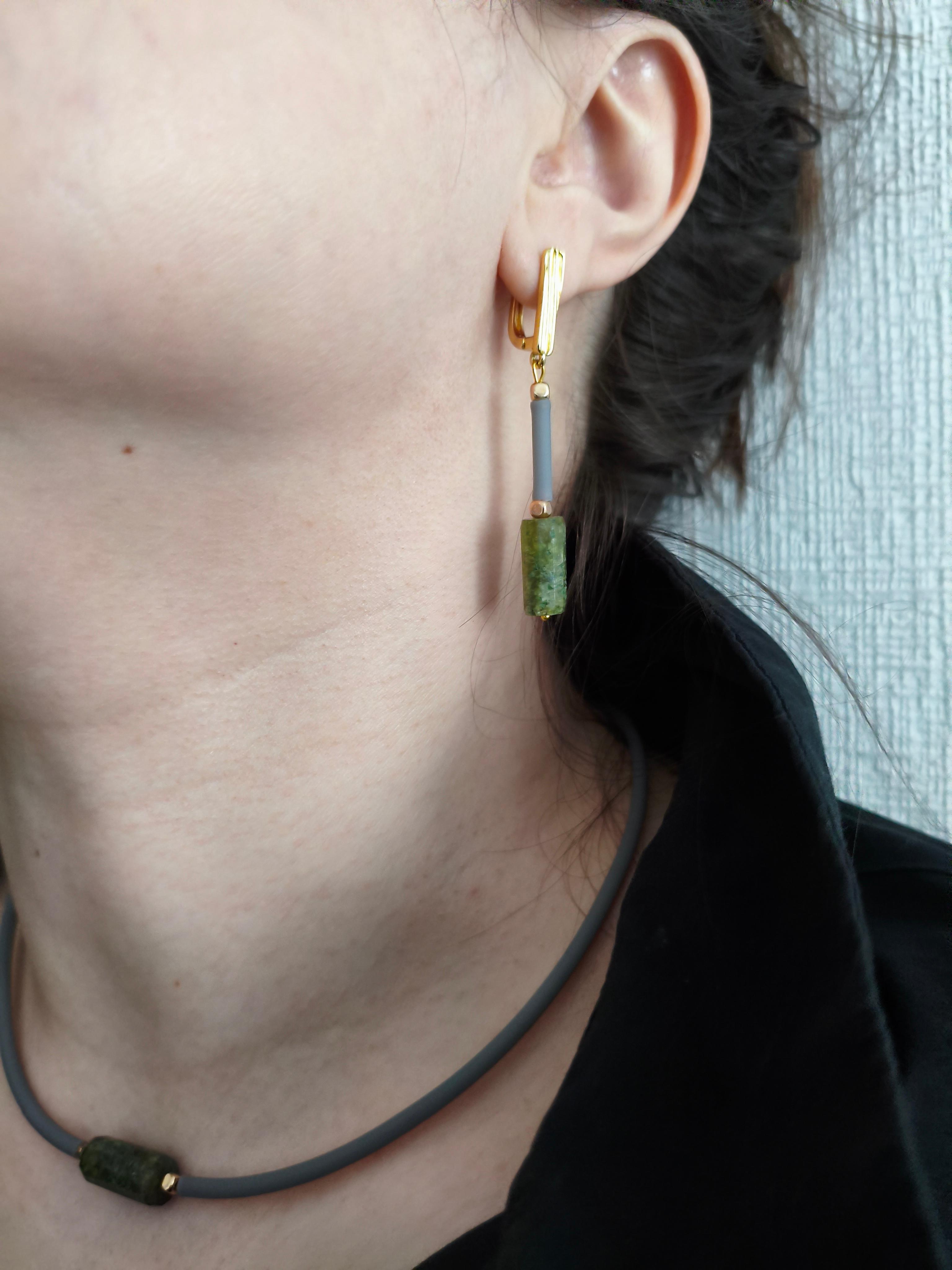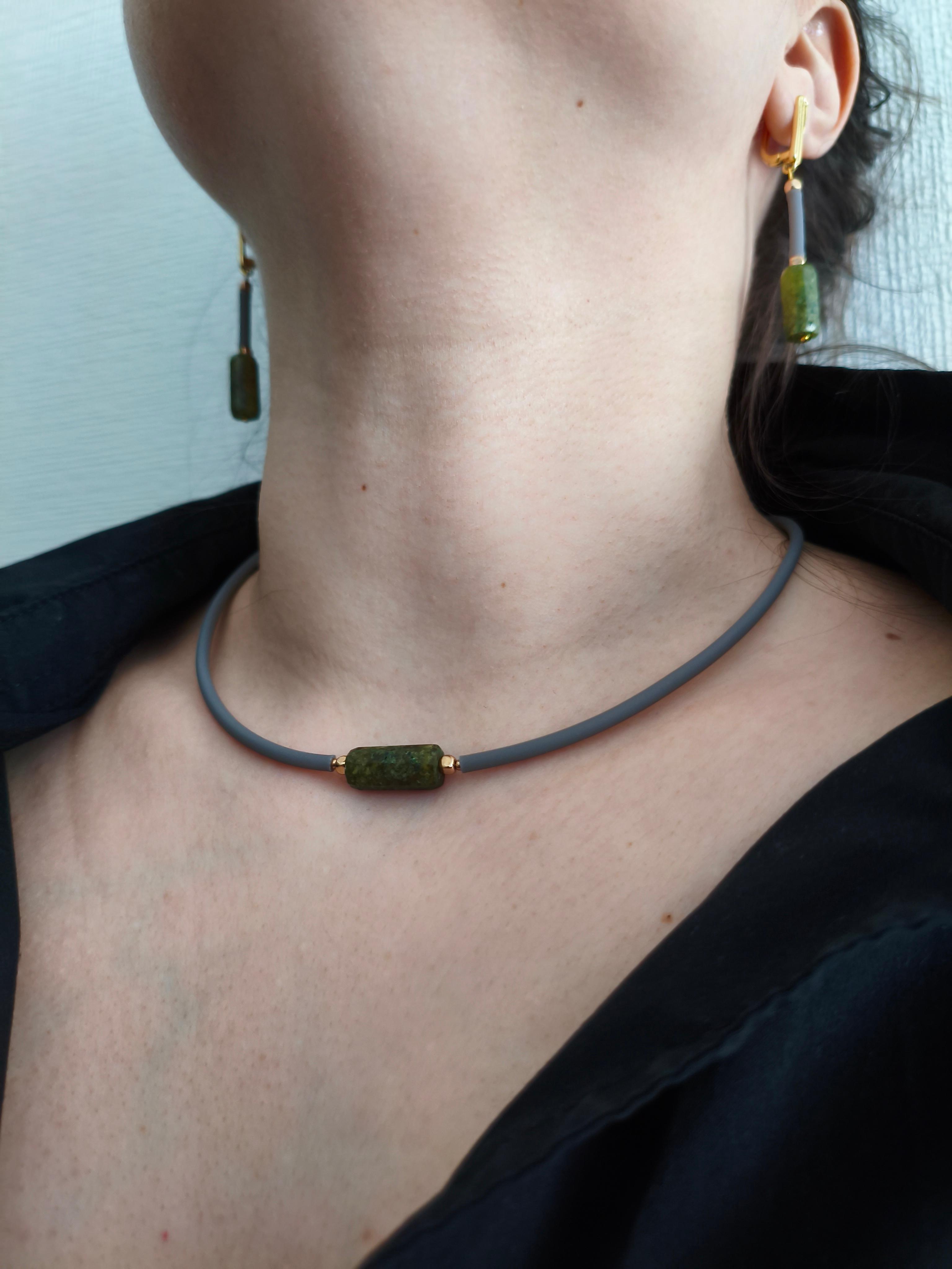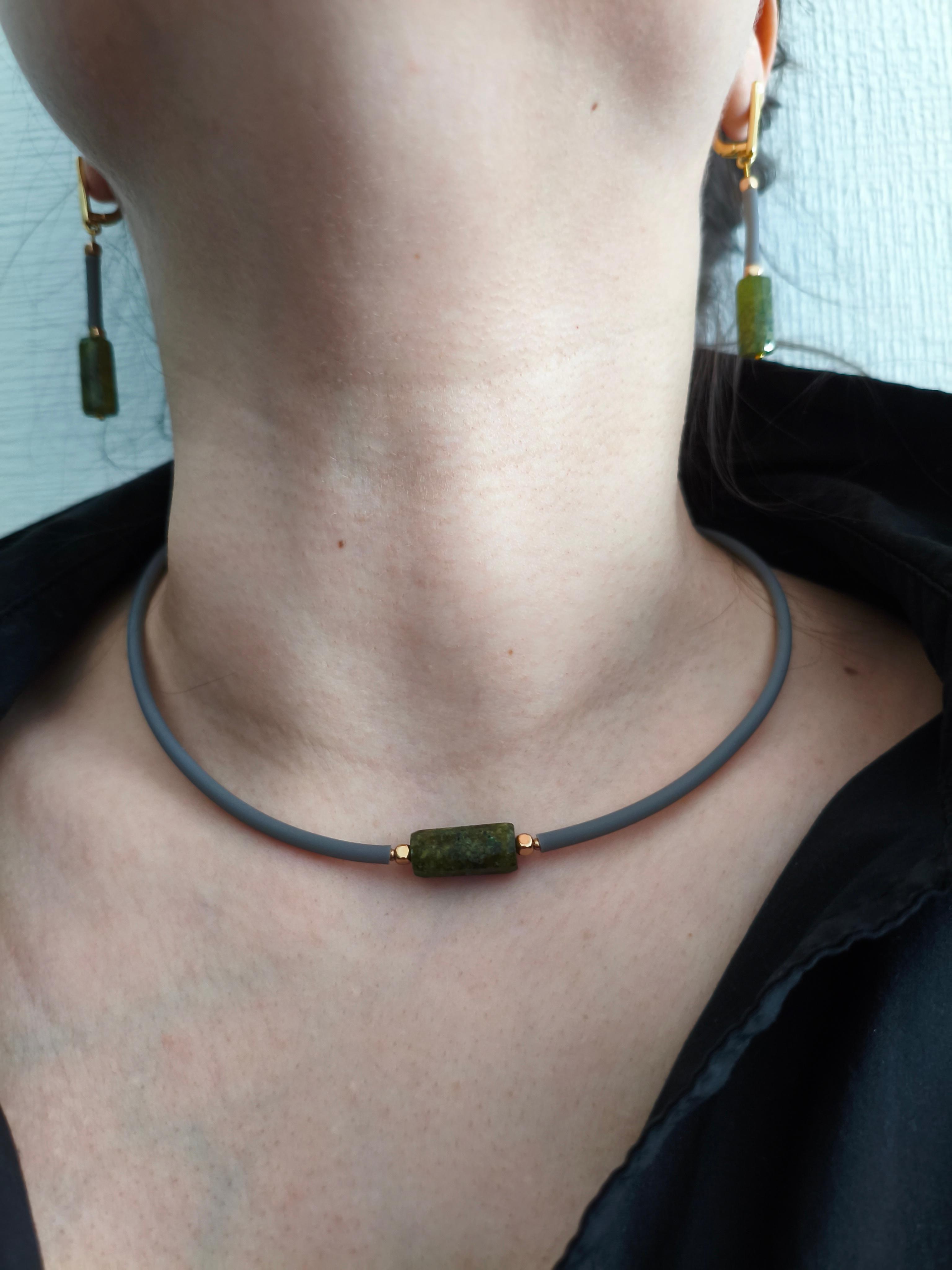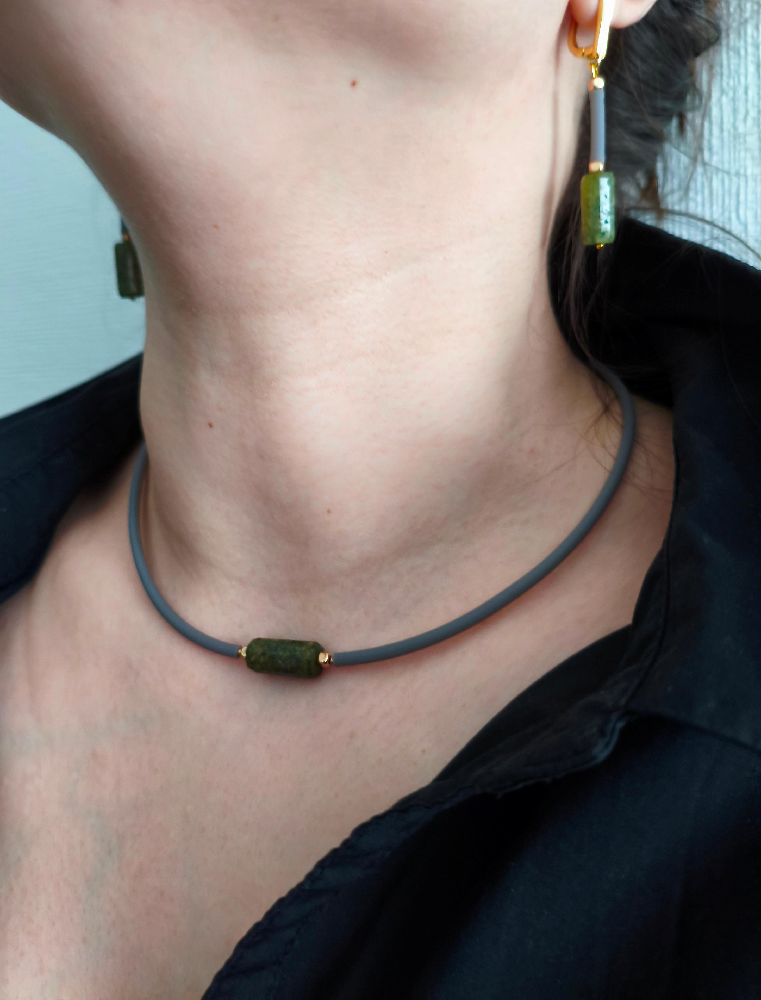 Серьги и чокер «Серая грань» ✅Серьги: Зеленый гранат граненый 16*7,5 мм + гематит + серый каучук/ фурнитура гипоаллергенное родиевое покрытие К18 золото. Длина от швензы 30 мм. Стоимость: 1600 руб. ✅Чокер: Зеленый гранат граненый 16*7,5 мм + гематит + серый каучук / золото. Длина 44-50 см. Стоимость: 1000 руб. #значение 🔺Зеленый гранат (демантоид, уваровит и др.): рост, исцеление и изобилие, способствует развитию интуиции и экстрасенсорных способностей, а также помогает рационально распоряжаться временем и ресурсами. 🔺Гематит: защита, заземление, сила воли, восстановление энергии, помощь при стрессе.