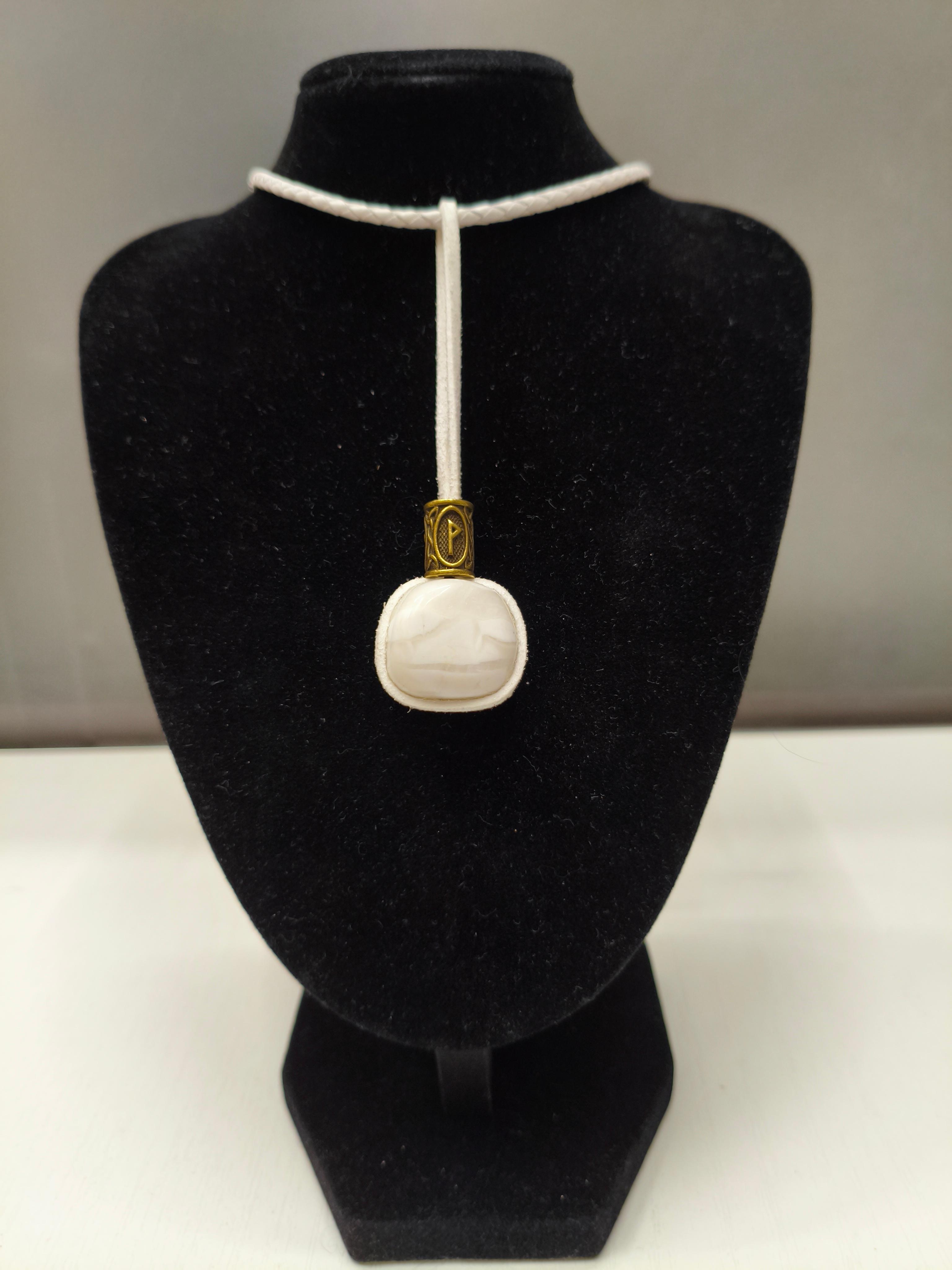 Амулет «Снежок» из белого агата 24*22*14 мм (длина подвески 85 мм) + руна Вуньо + белая кожа и замша/фурнитура бронза/золото. Длина шнура 41,5-47 см #Значение амулета: ✅Белый агат: камень чистоты, умиротворения, защиты от негатива; гармонизирует мысли, снимает тревогу. ✅Вуньо (ᚹ):руна радости, удовлетворения, исполнения желаний; приносит лёгкость, счастье. ⭕️Синтез: амулет для внутреннего покоя и радости. Снимает стресс, помогает видеть светлые стороны жизни, создаёт атмосферу гармонии.