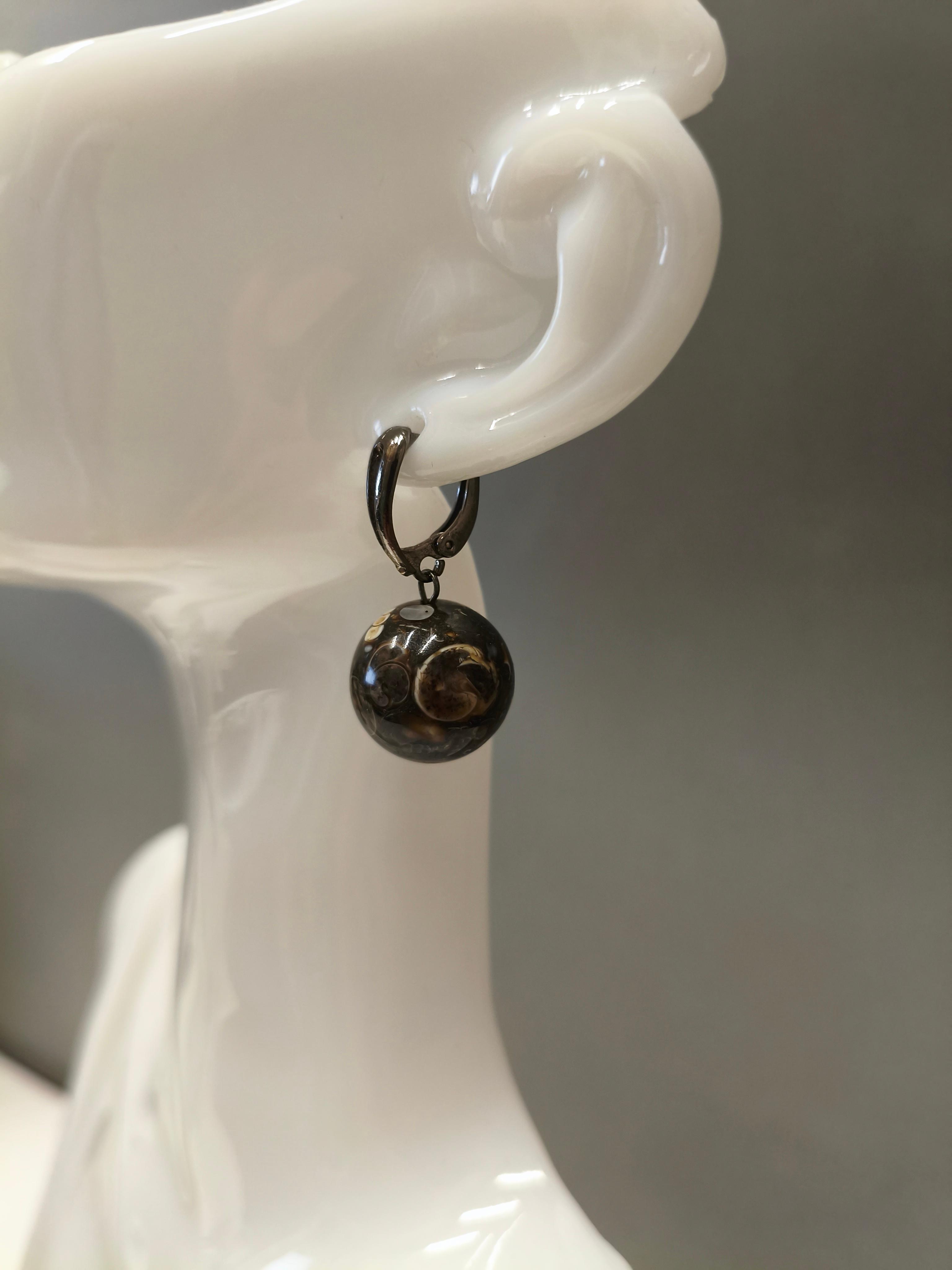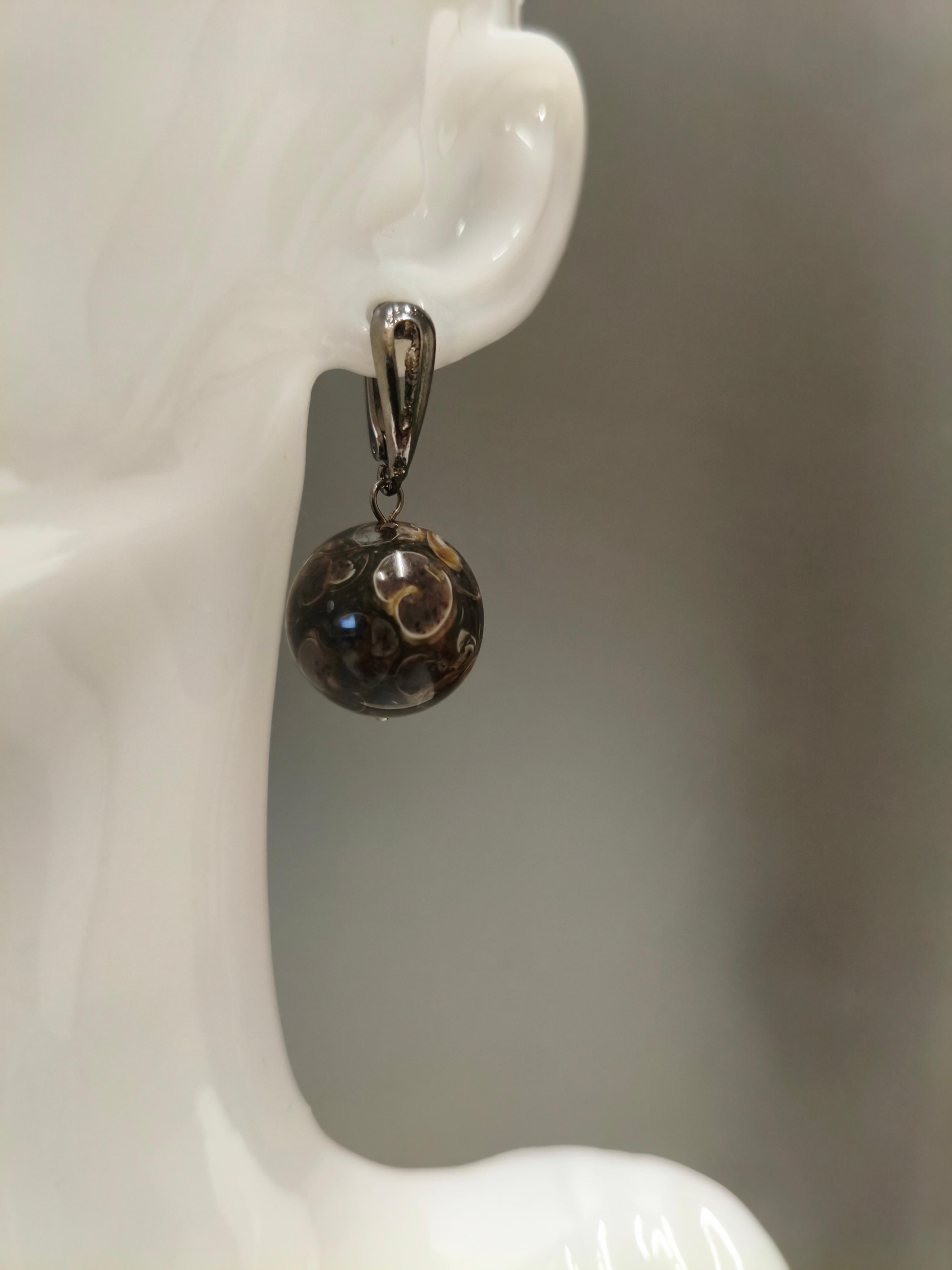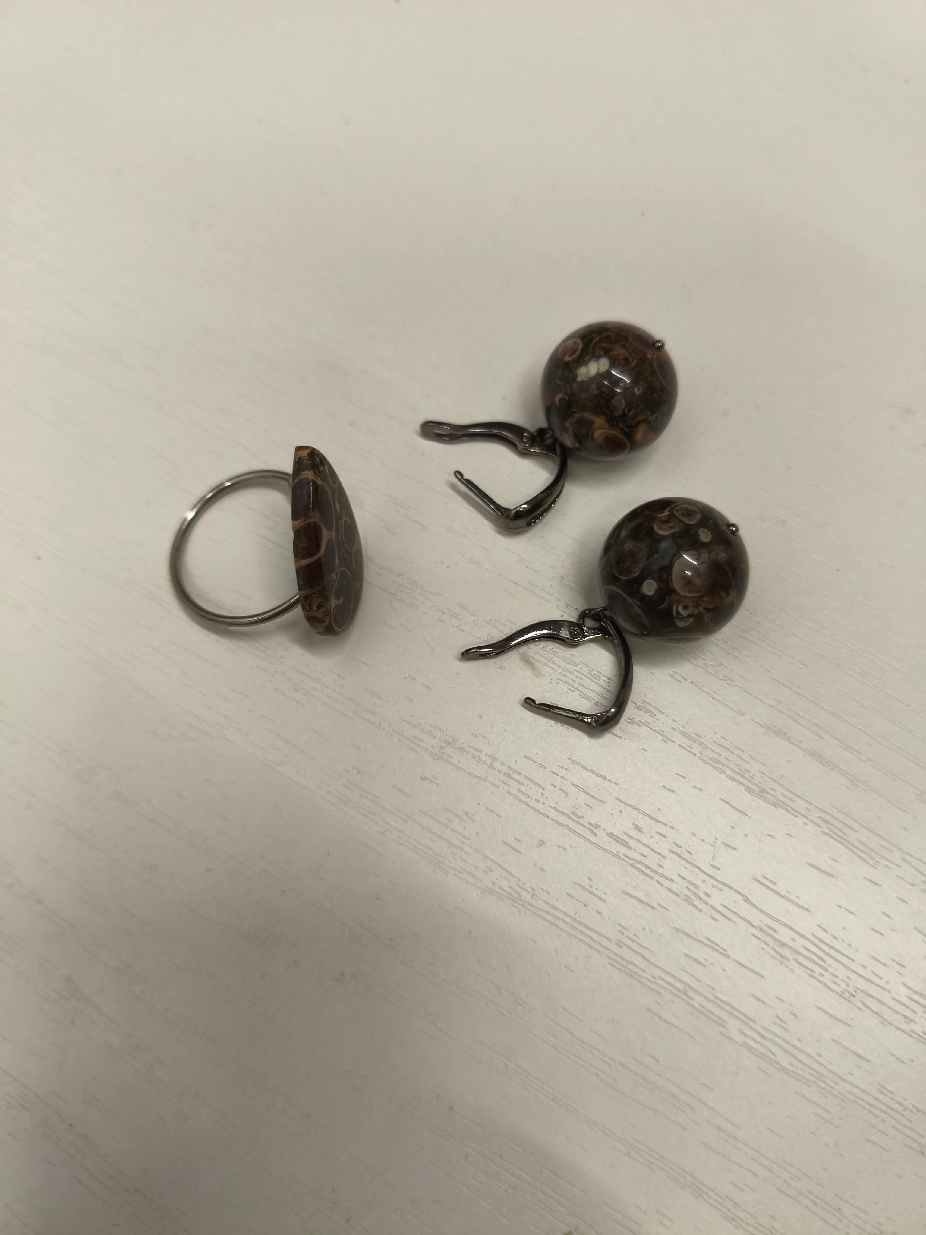 Серьги и кольцо «Тортилла» ✅Серьги: Турителла (Черепаховый агат) ф 16 мм/ фурнитура гипоаллергенное родиевое покрытие черный цвет. Длина от швензы 20 мм. ‼️БРОНЬ‼️ #значение 🔺Турителла (черепаховый агат): помогает обрести внутреннюю гармонию, защититься от негативных воздействий и усилить связь с энергией прошлого благодаря своим ископаемым включениям. Редкое ювелирно-поделочное ископаемое (пресноводные улитки рода Elimia tenera – эпоха эоцена) Грин-Ривер, штат Вайоминг (США).