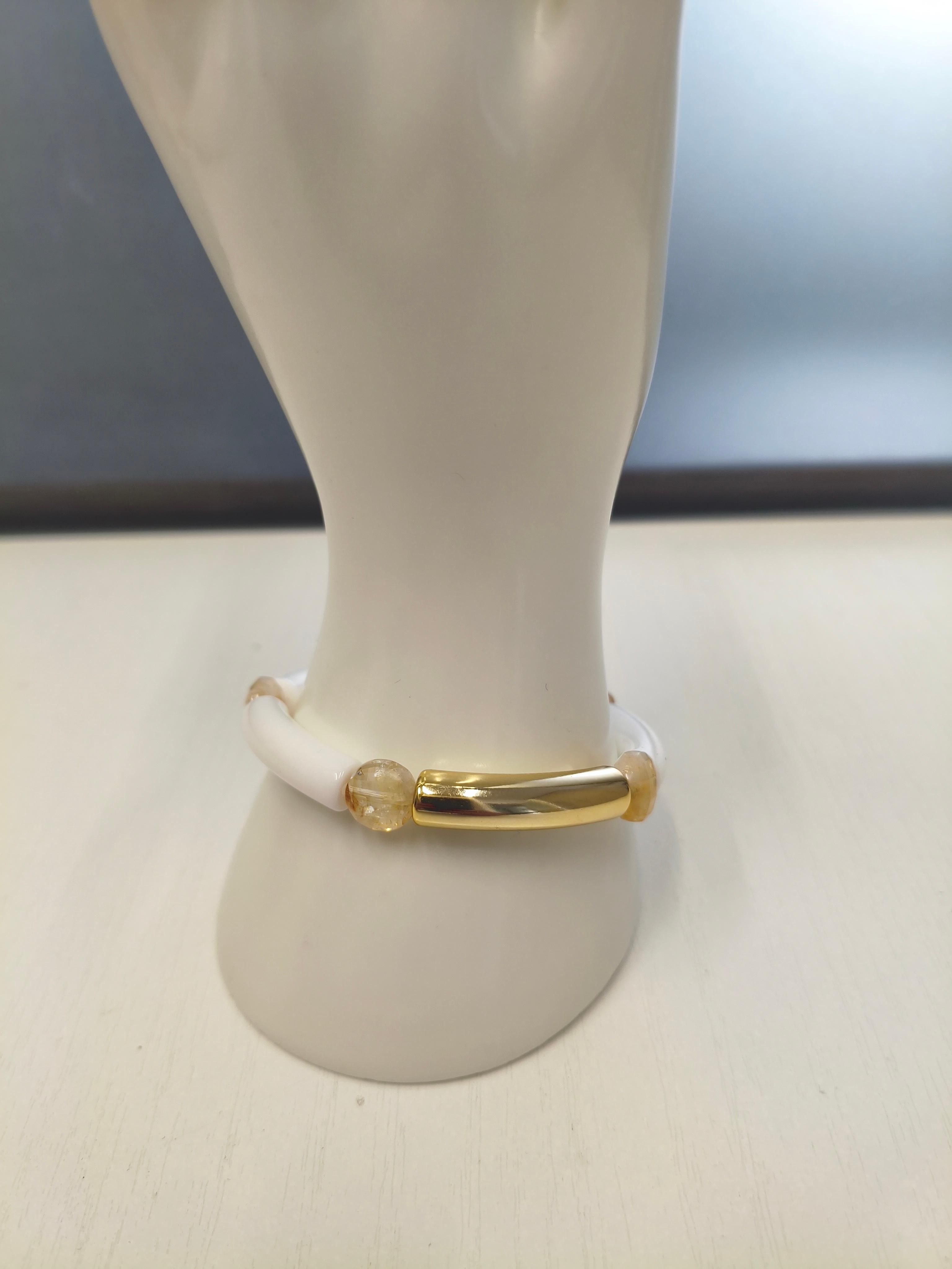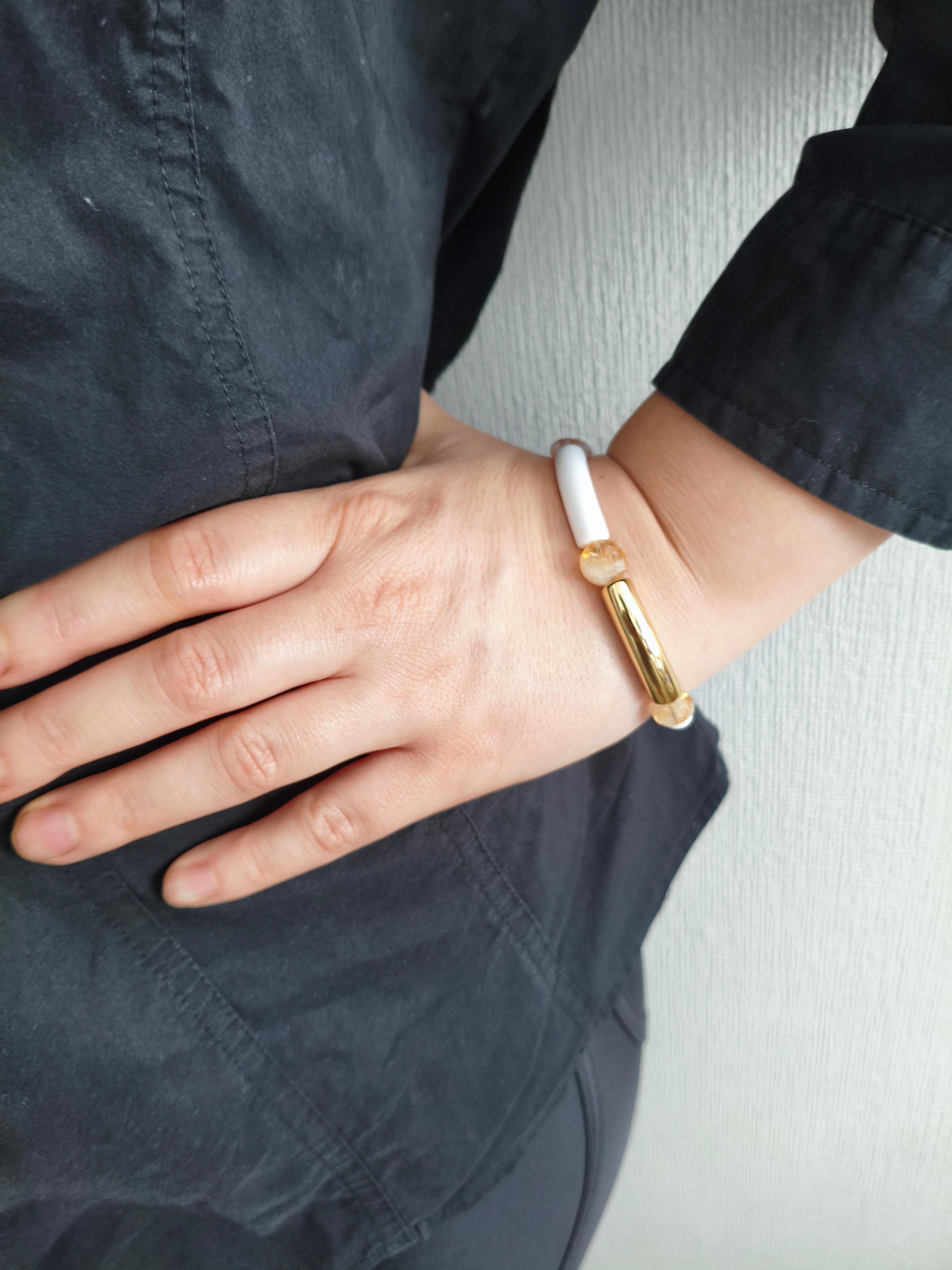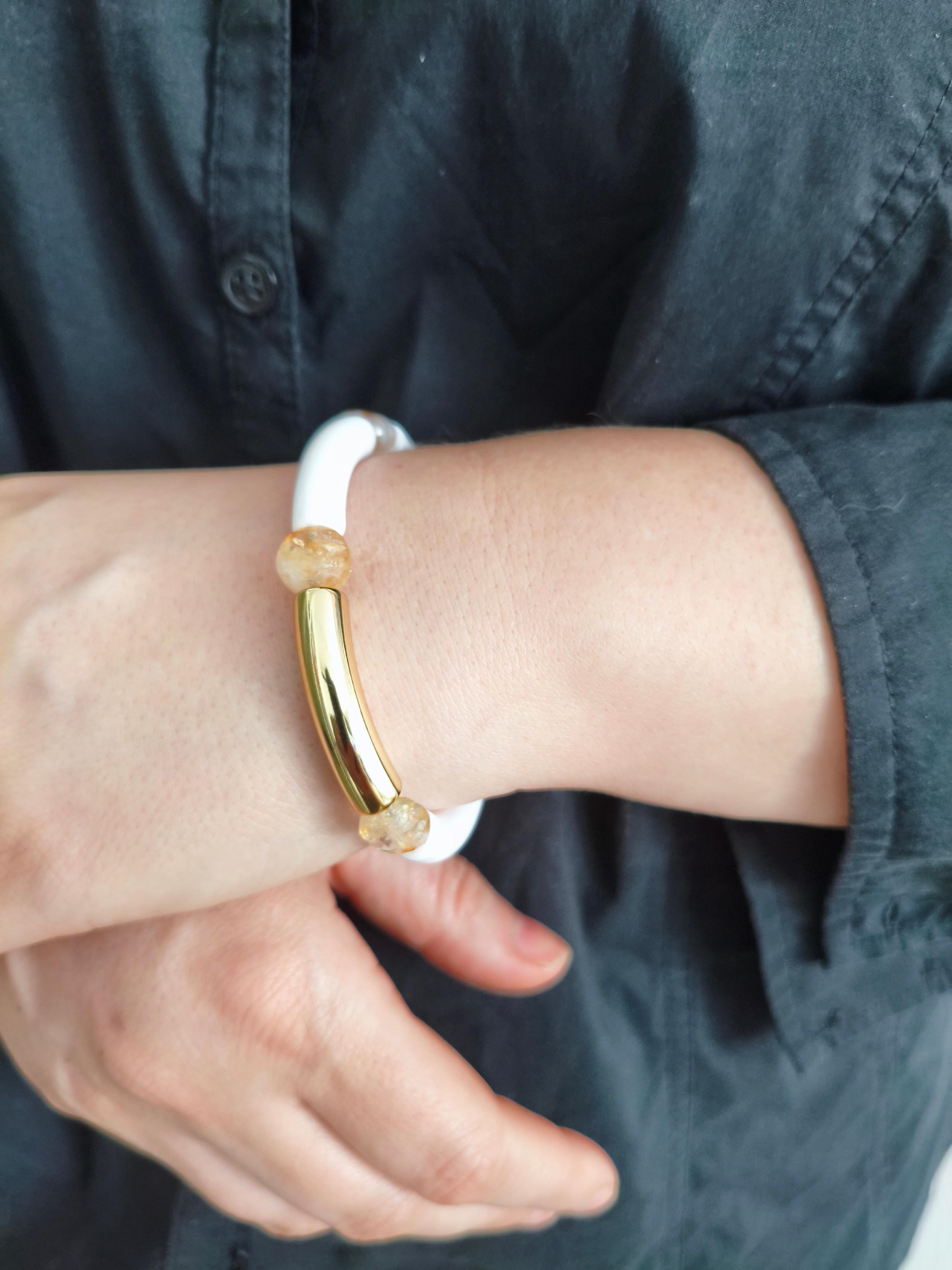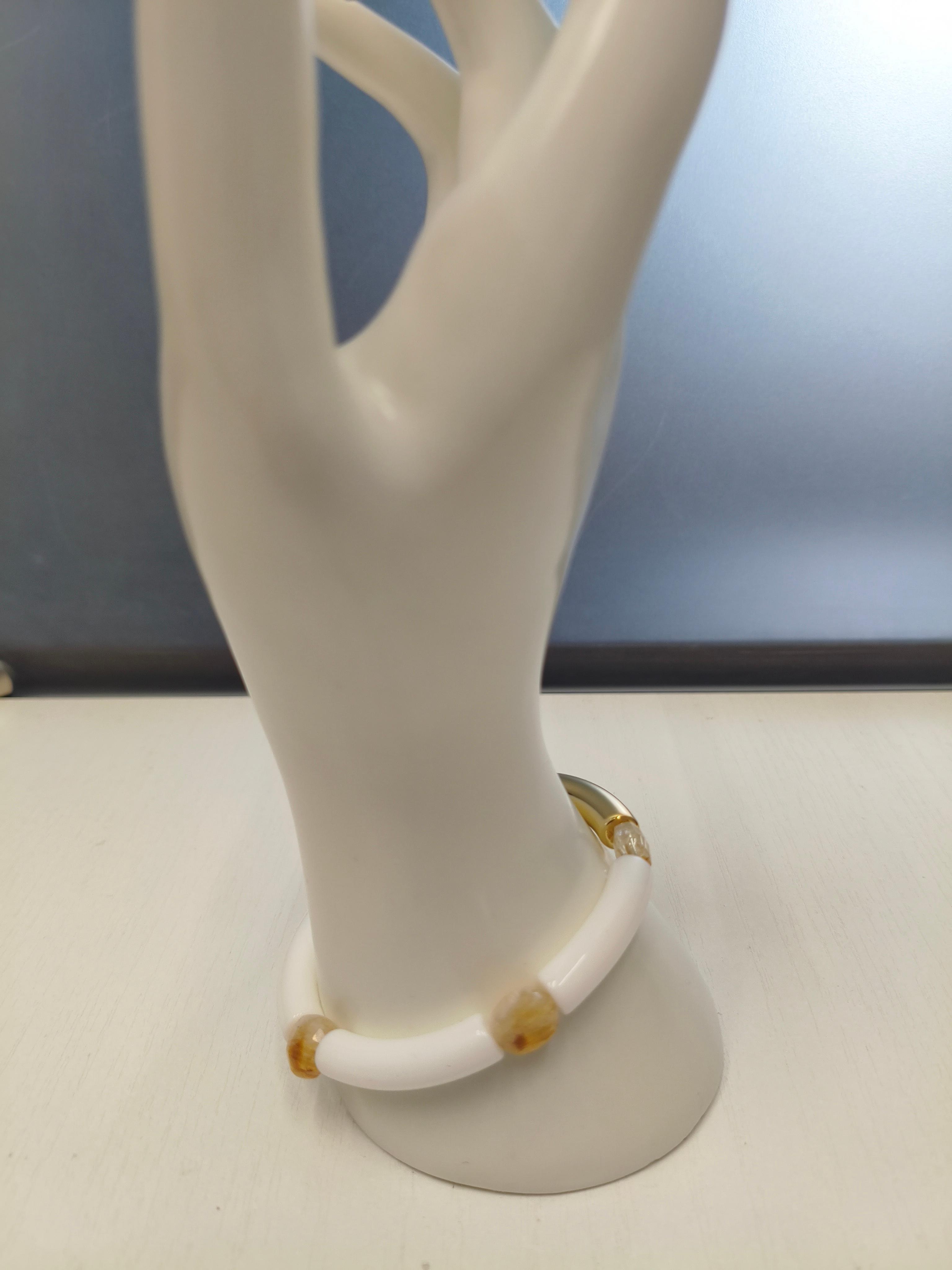 Цитрин граненые бусины 10*5 мм + акрил белый/золотой. Безразмерный на резинке/ держит форму / можно купаться) Подходит в комплект с серьгами "Три Ци" #значение Цитрин: изобилие и процветание, притягивает финансовое благополучие, усиливает уверенность и защищает от негатива.