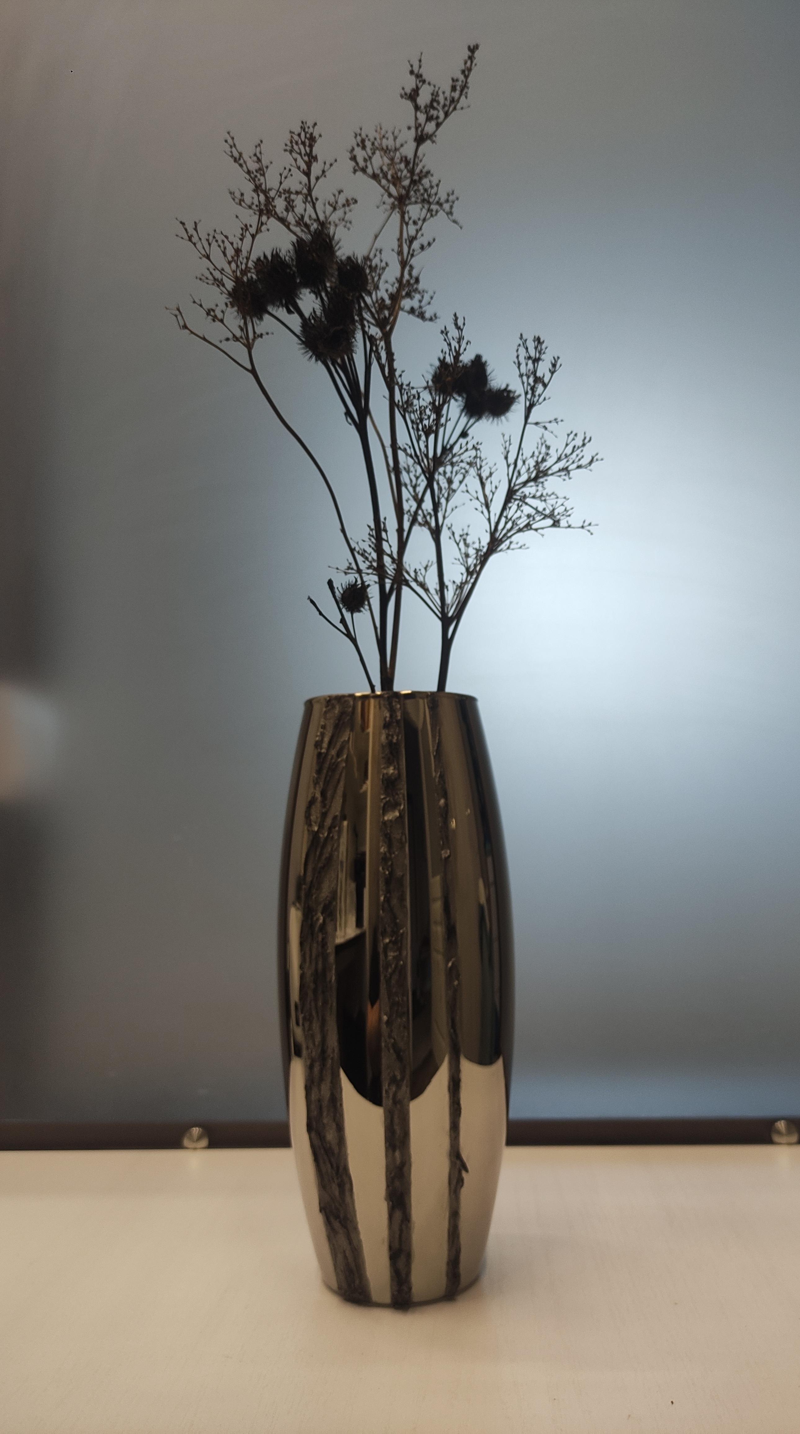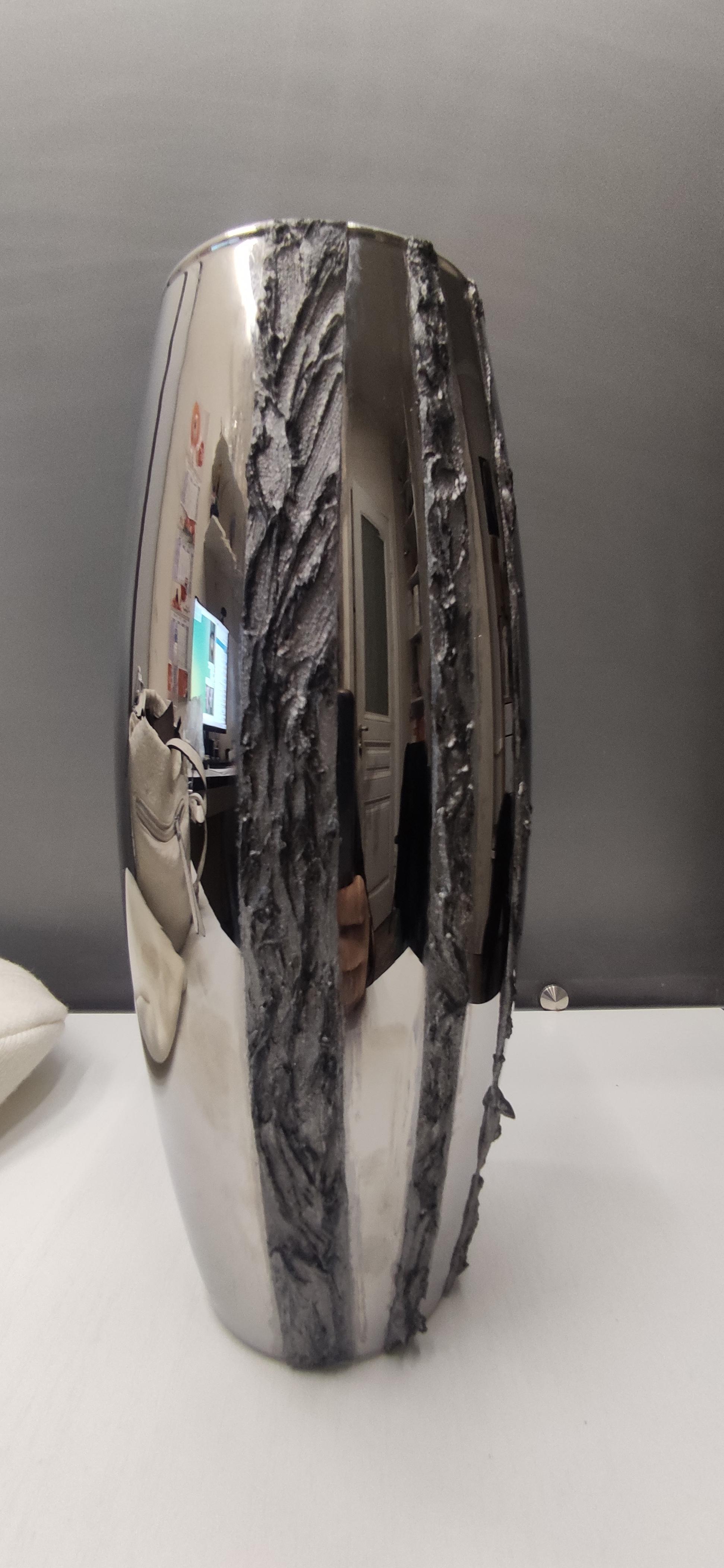 Ваза стеклянная с зеркальным металлизированным покрытием и полимерным объемным дизайнерским декором снаружи (влагостойкое). Ручная работа. Единственный экземпляр. Высота 26 см Диаметр по верхнему краю 8 см В наличии нет/куплено