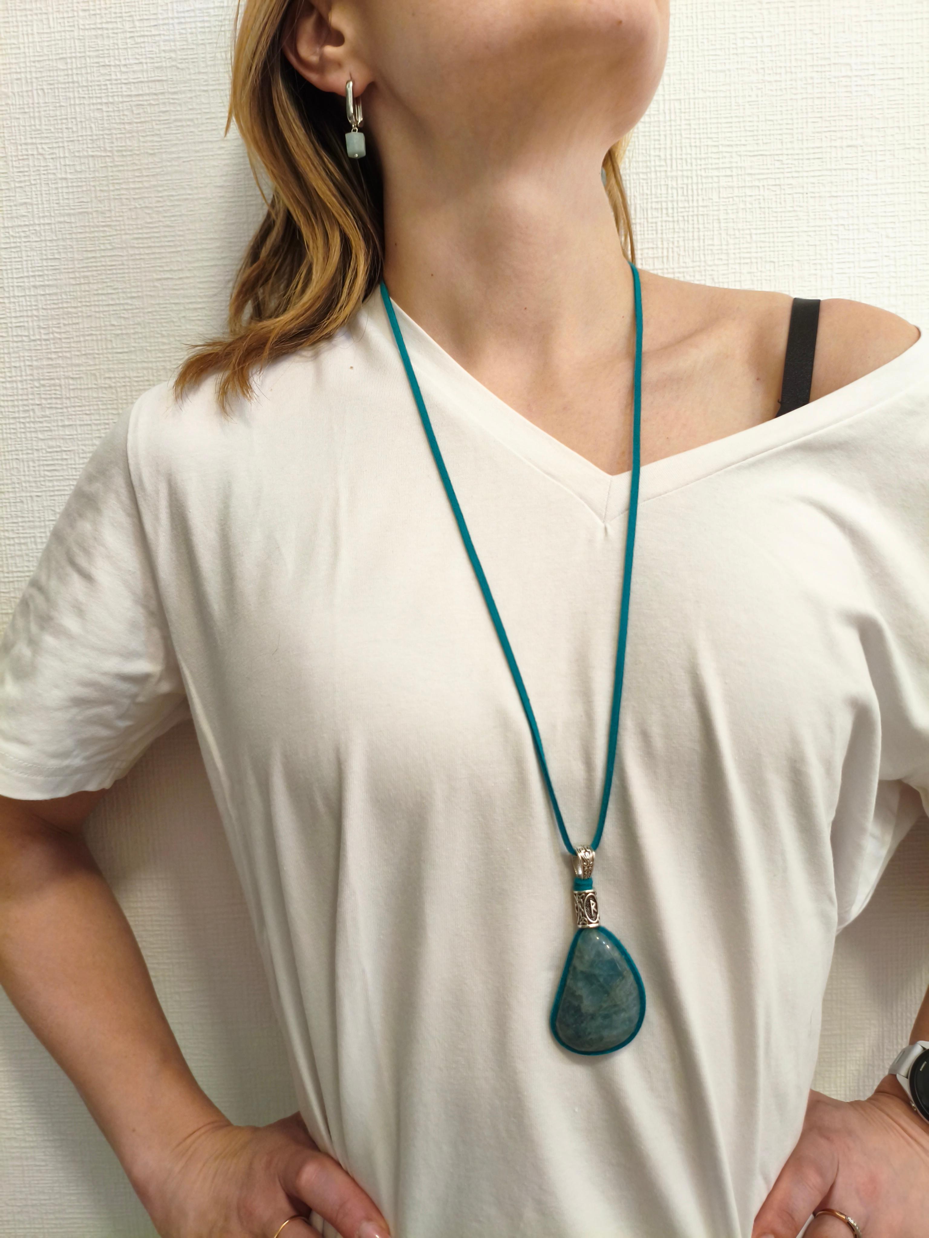 Натуральный аквамарин 45*33*9 мм (камень большой) с бирюзовой замшей (ширина 3 мм) и руной Райдо на бейле (подвеска). Цвет античное серебро/ювелирный сплав износостойкий. Кулон съемный. Длина кулона 75 мм, шнура - 77,5-83,5 см/регулировка на длину цепочки с замком - карабином Можно носить с серьгами "Аква" в качестве комплекта. Синтетическое значение камня и руны можно узнать здесь https://t.me/kodkamnya_ru/57 либо краткое значение в разделе на сайте