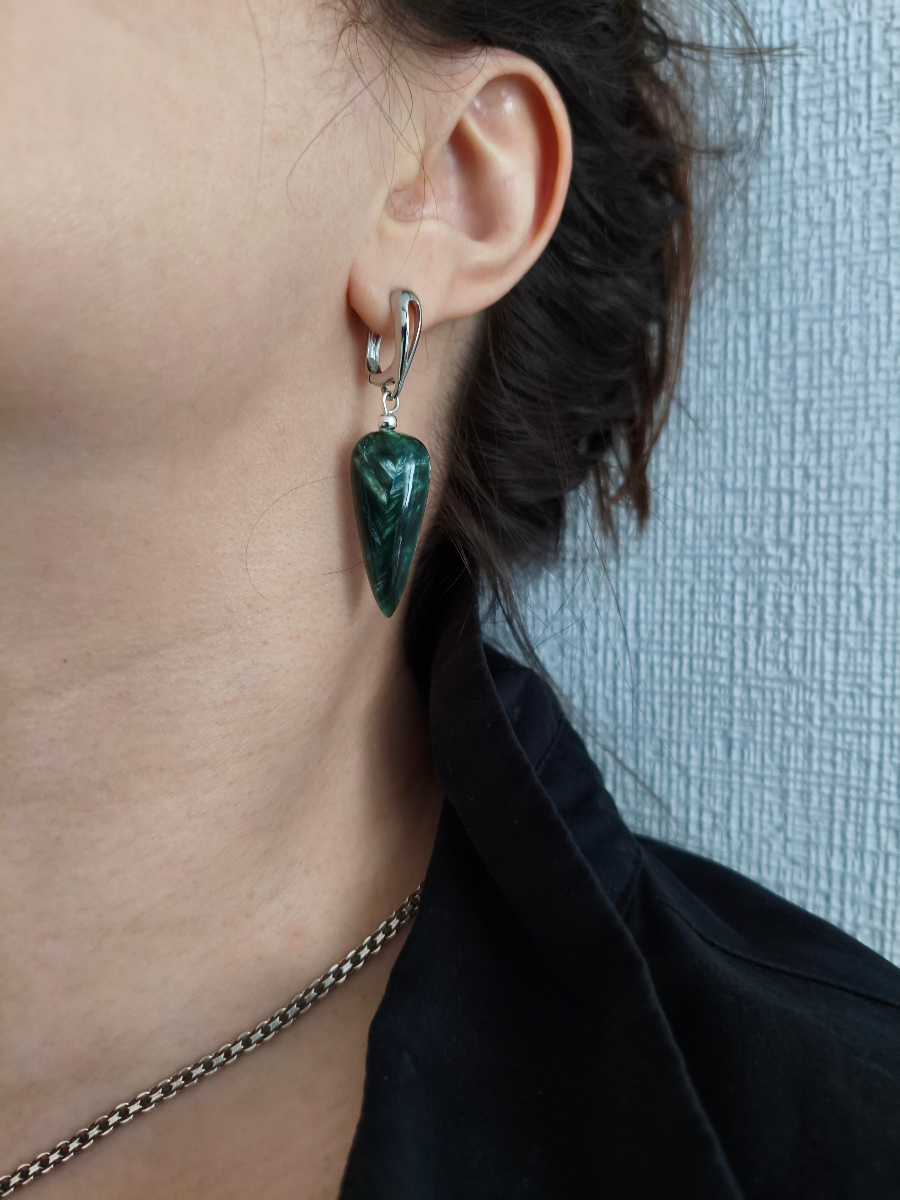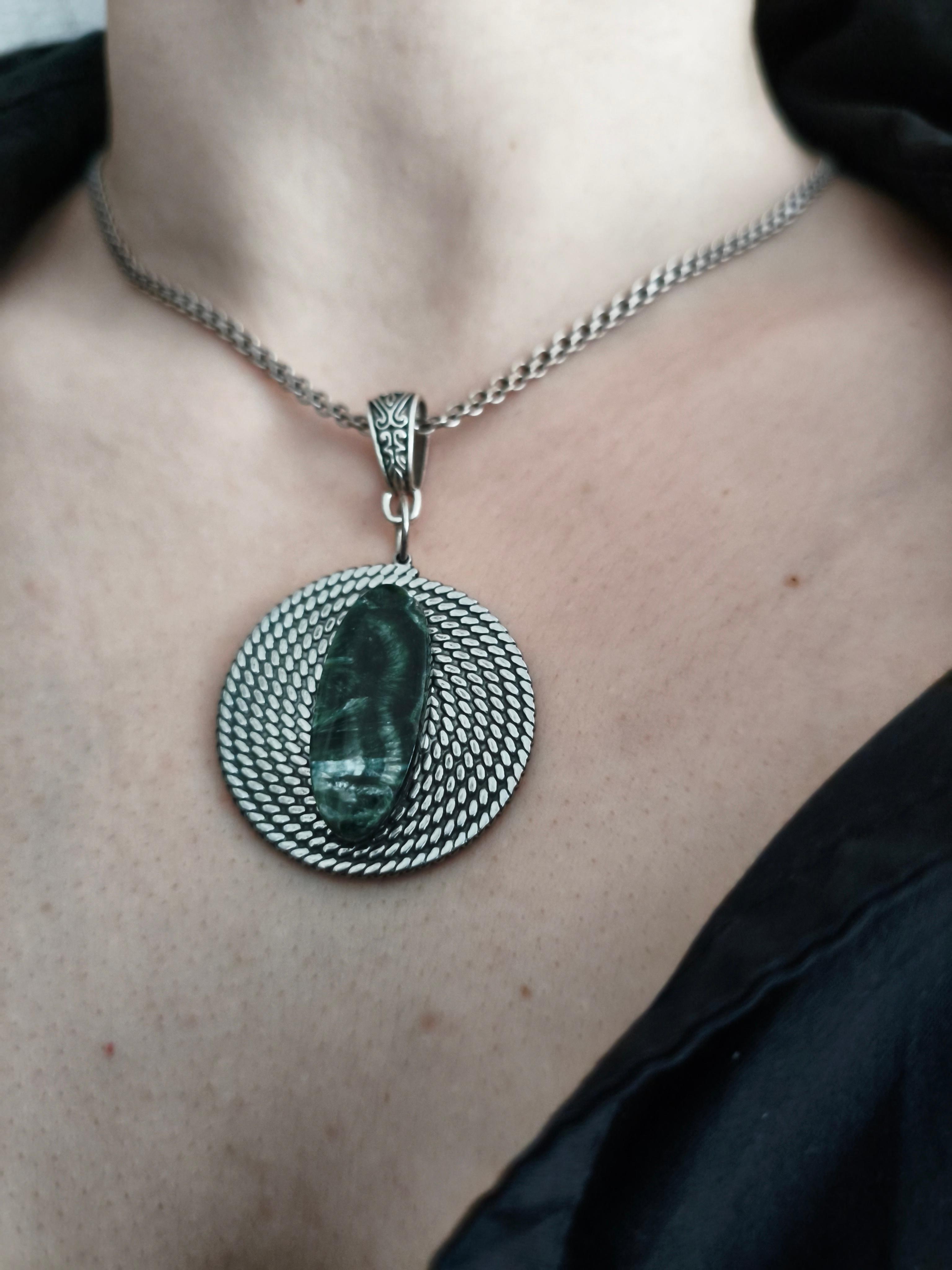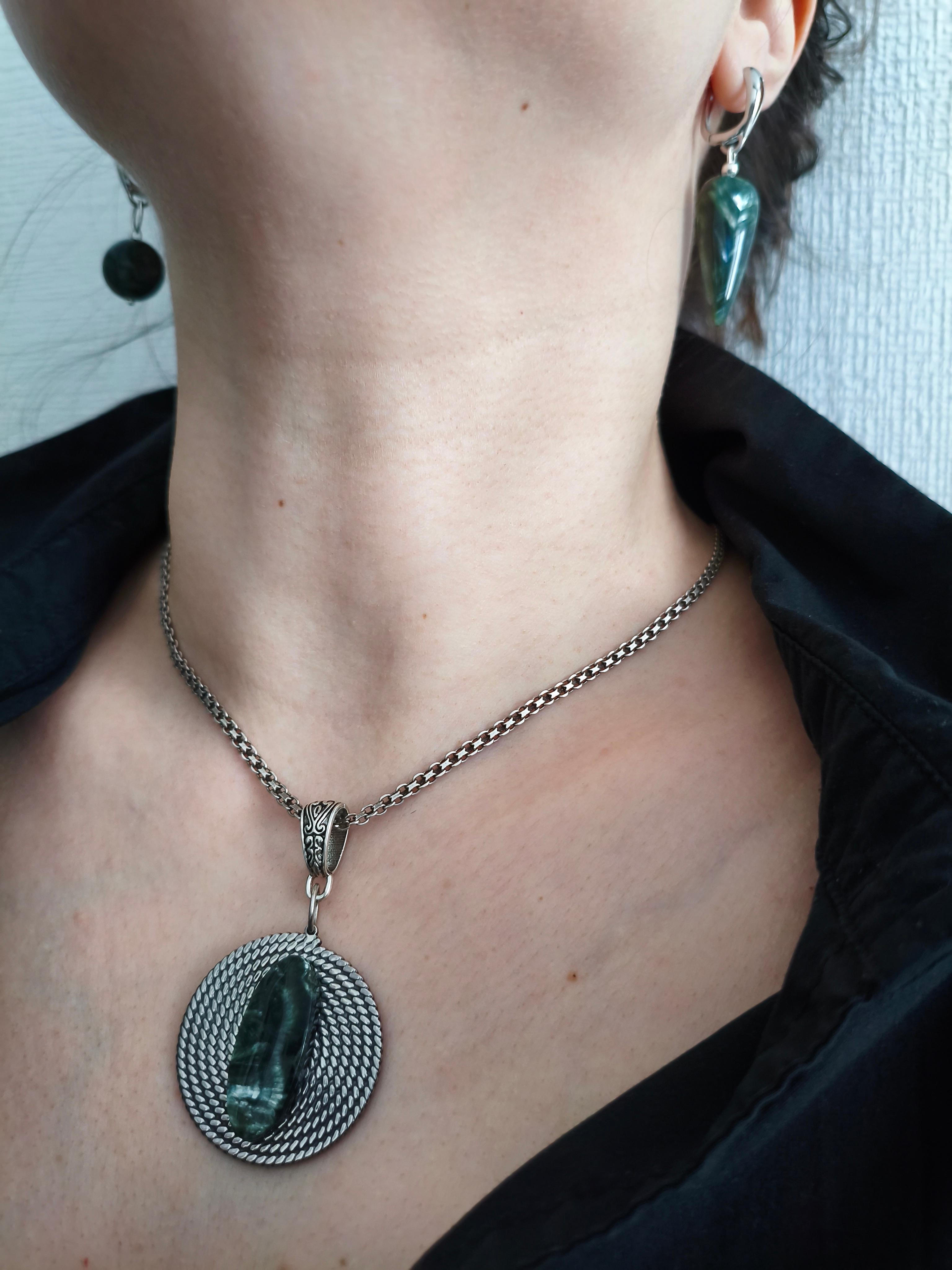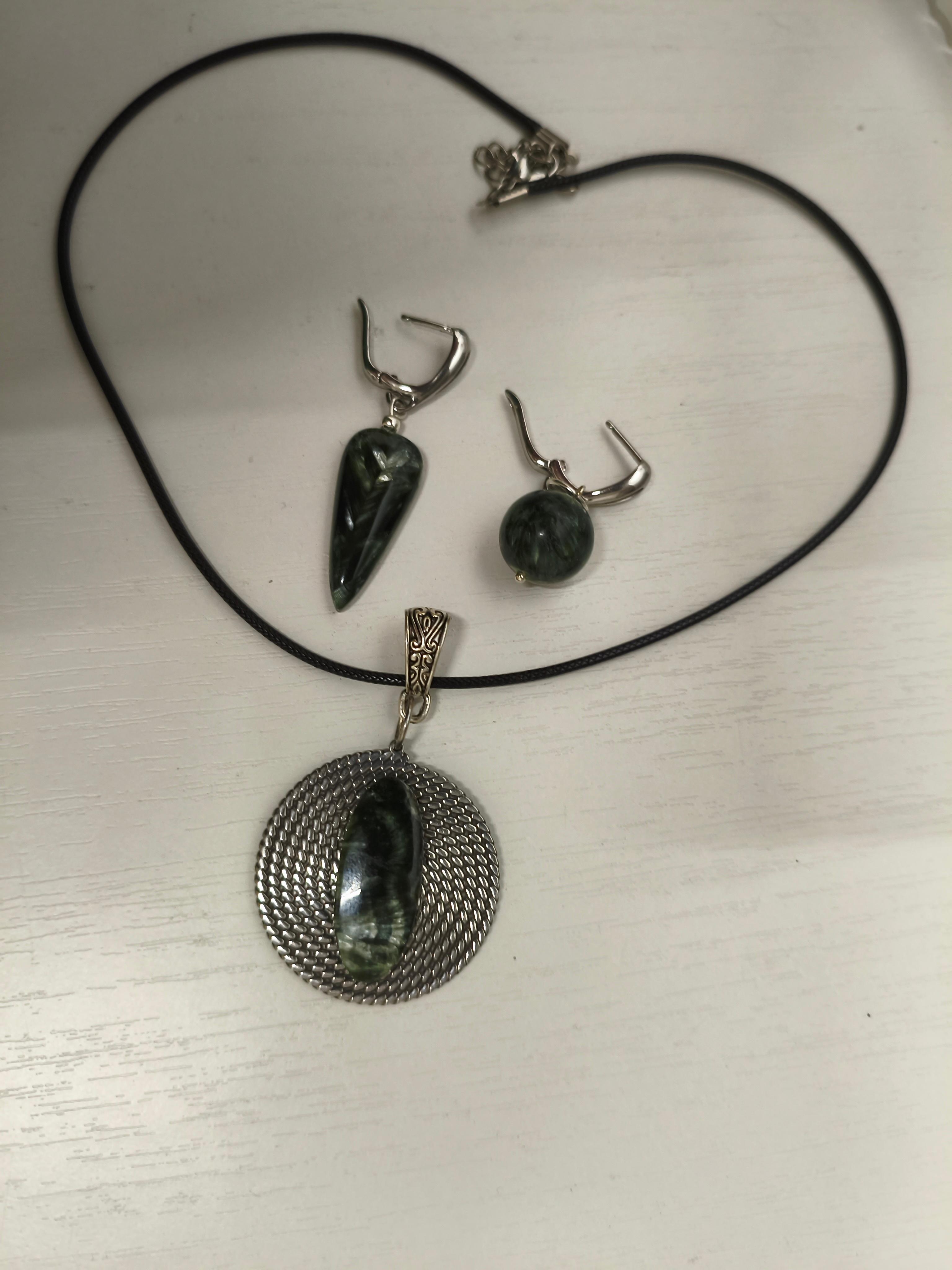Серьги и колье «Глаз Дракона» ✅Серьги асимметричные: Серафинит ф 14,4 мм + 30.5х13.2х5.7мм/ фурнитура гипоаллергенное родиевое покрытие серебро. Длина от швензы 35 и 25 мм. Стоимость: 2850 руб. ✅Колье/подвеска: Серафинит 28.4х12х4.2мм + нерж. сталь витая шайба + вощеный шнур /античное серебро. Длина шнура 44-49,5 см. Длина подвески 55 мм/съемная. Стоимость: 800 руб. #значение 🔺Серафинит (клинохлор): камень духовного роста и гармонии, помогает раскрыть интуицию, защищает от негатива, способствует исцелению и устанавливает связь с высшими силами.